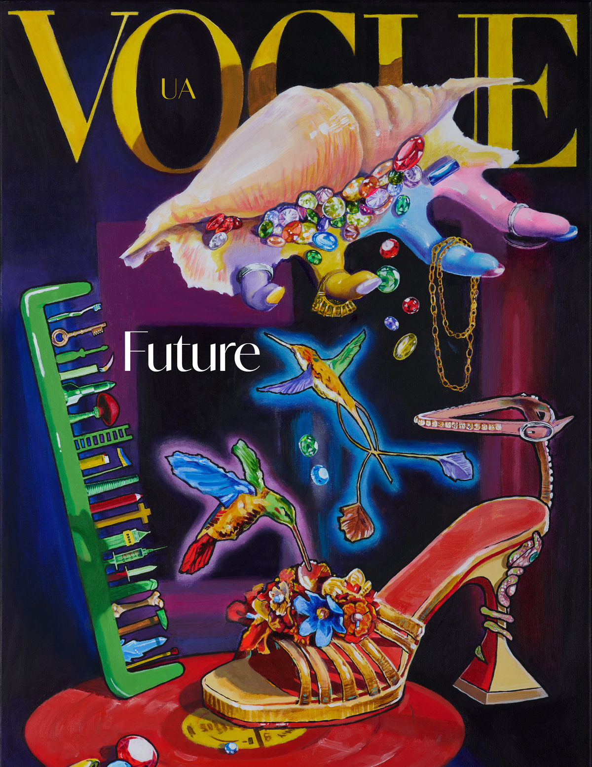 CURRENT PROJECT, THE "CONDITIONAL COVER" IS CREATED ON CANVAS ACCORDING TO THE RULES OF A REAL MAGAZINE ONE, AND THE ELEMENTS OF THEIR OWN WORKS ARE PLACED NEXT TO THE ILLUSTRATIONS OF FASHION TRENDS. THIS IS HOW