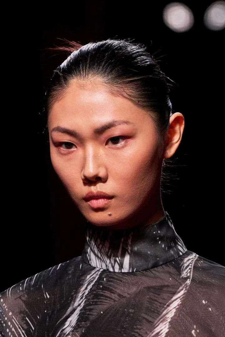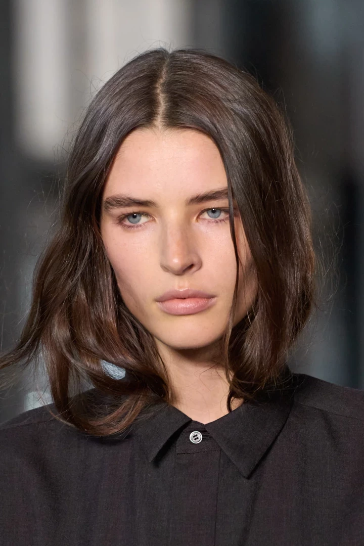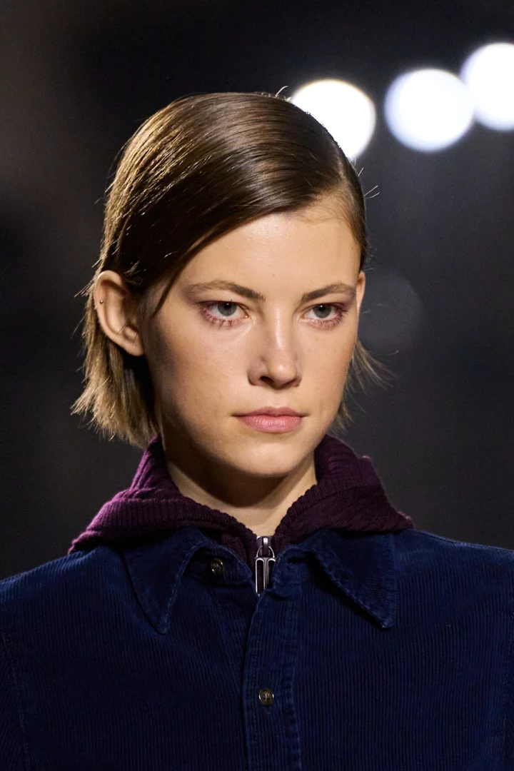 Hermès пропонують глянцеве, дзеркальне волосся, що натякає на характерний для дому бездоганний лоск. Це повна протилежність скуйовдженому стилю Prada: строгість, мінімалізм, відображення.