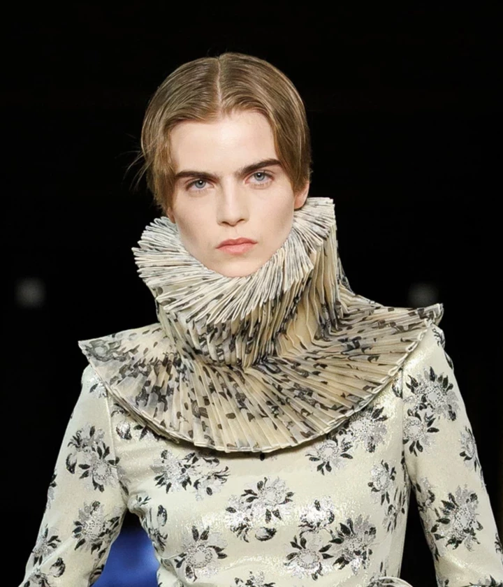 Schiaparelli віддають перевагу глибокому боковому проділу, зафіксованому з математичною точністю. Це глянцевий, зафіксований тренд сезону для волосся.