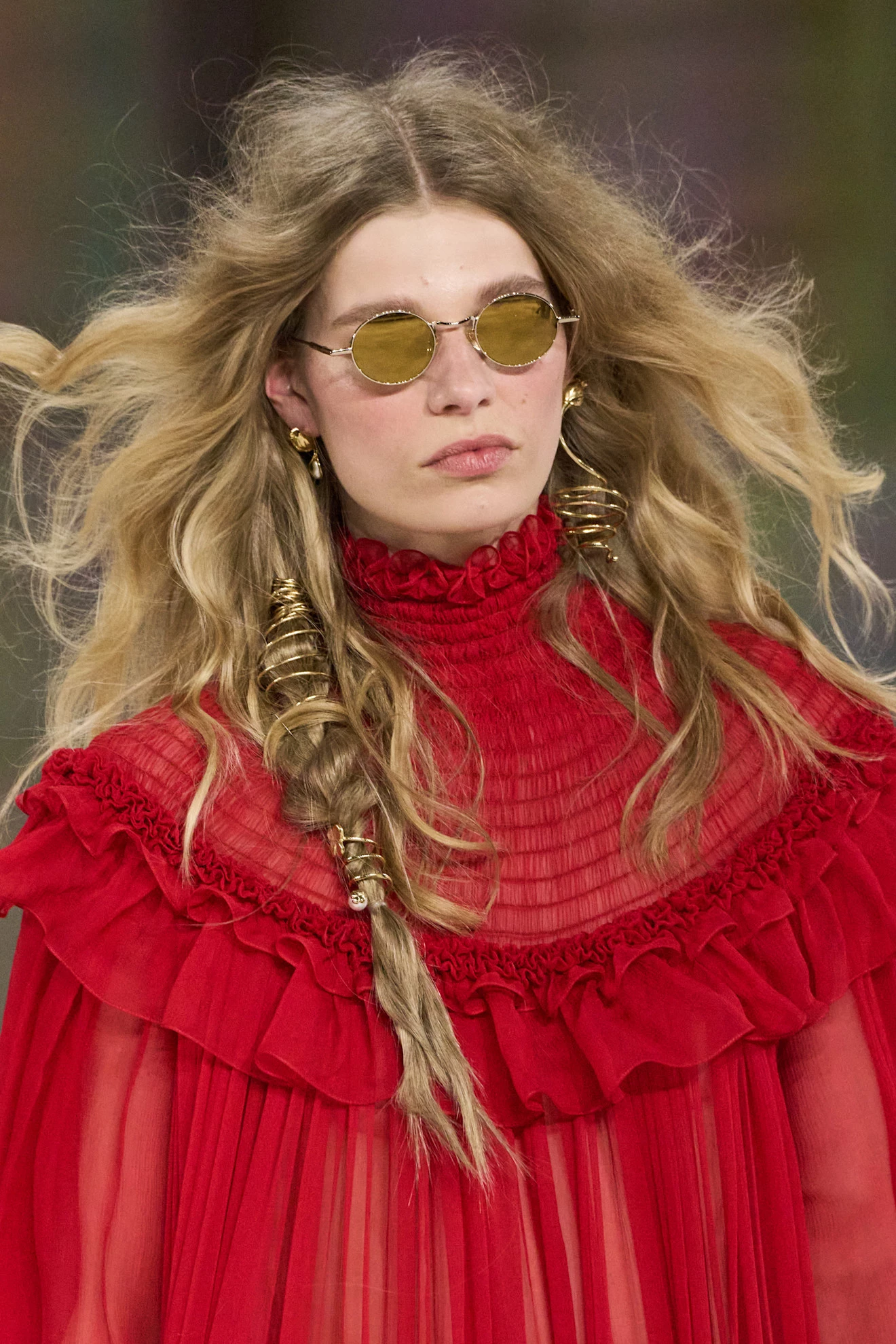 Фірмовий effortless-стиль дівчини Chloé цього сезону переосмислили: довге хвилясте волосся прикрашали дрібними косами з ювелірними деталями та мушлями. У результаті вийшов дикий і водночас сміливий образ.