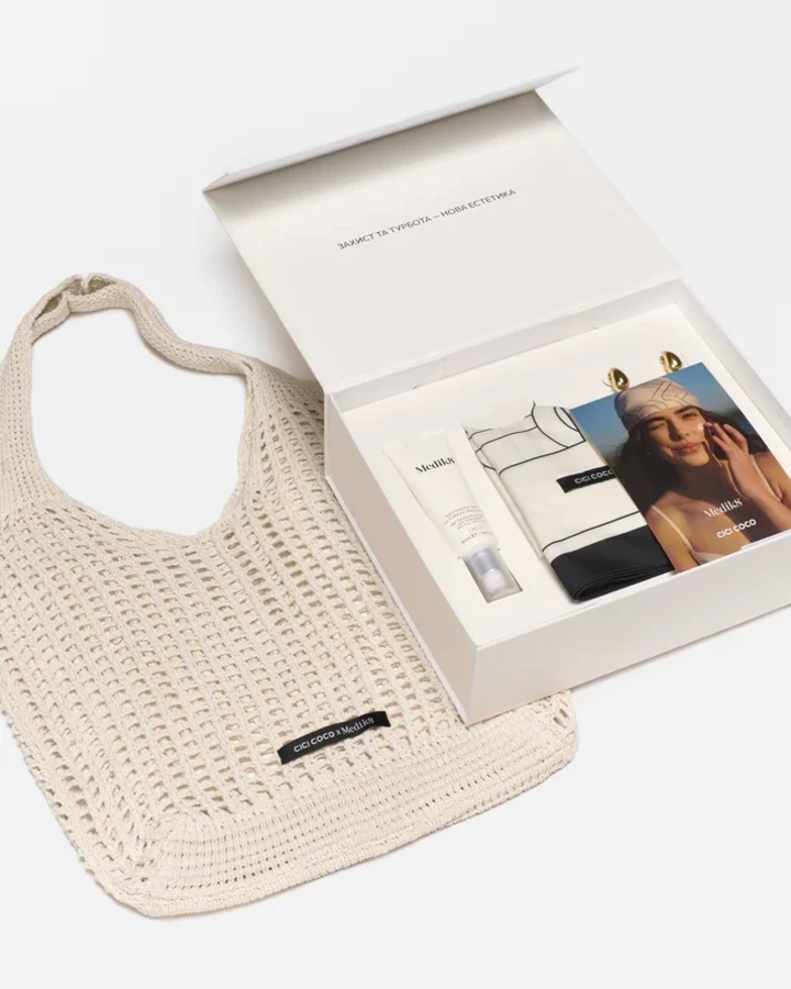 Cici Coco, модний бренд із львівським корінням, представив літню б'юті-капсулу разом із британським skincare-брендом Medik8. У межах колаборації створено подарунковий сет, що містить симпатичну плетену сумку, протисонцевий засіб Medik8, сережки-краплі та літню хустину.