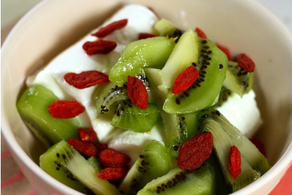 Выложите творог в миску и полейте медом. Очистите киви от кожуры, нарежьте и выложите на творог. Добавьте ягоды годжи и перемешайте.