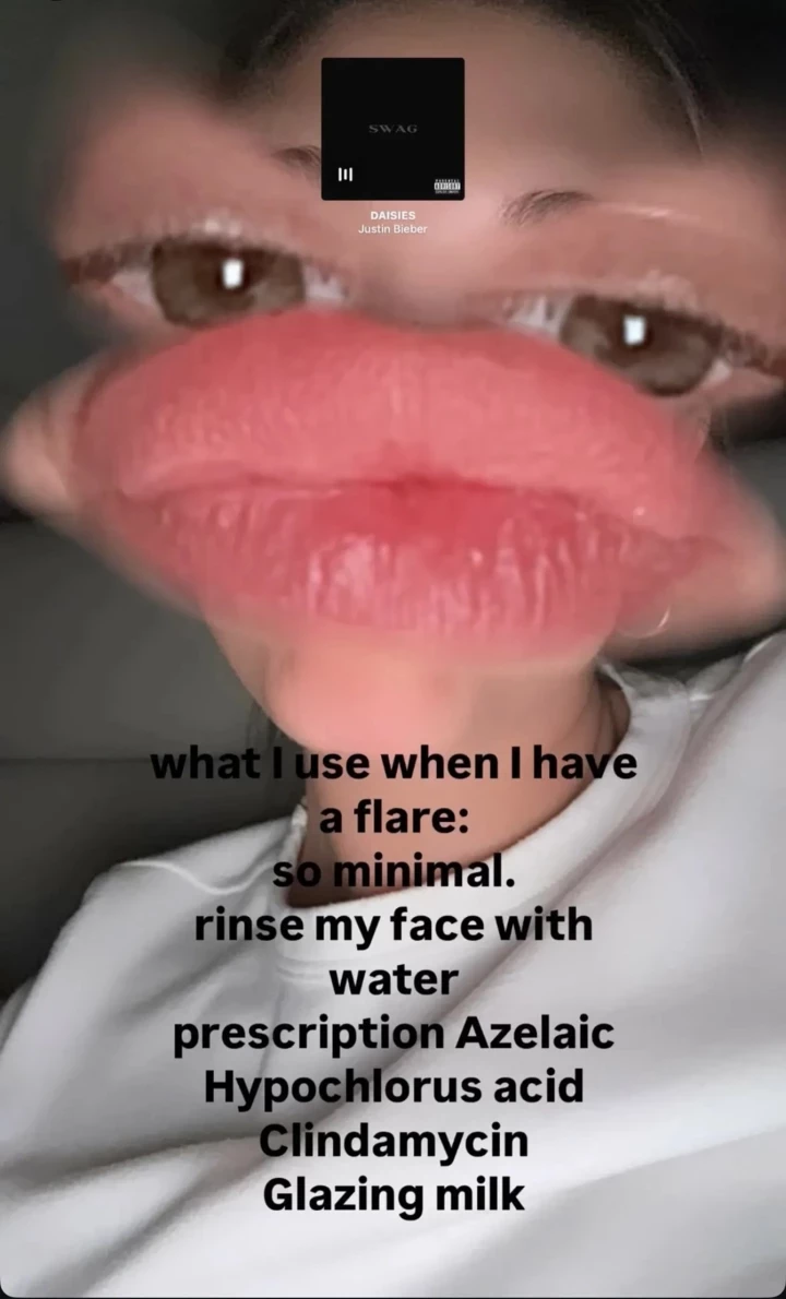 Бібер у своїх інстаграм-сториз поділилася останнім досвідом загострення періорального дерматиту, виклавши селфі без макіяжу, на якому видно дрібні висипання та нерівності на нижній частині обличчя. У підписі вона зазначила, що загострення завжди трапляється, коли вона багато подорожує, мало спить, через гормони, невідповідний SPF, нові продукти, стрес. Дерматологи поки що не можуть точно сказати, що саме викликає цю проблему — досліджень недостатньо, — але багато хто з пацієнтів описує подібні фактори.
