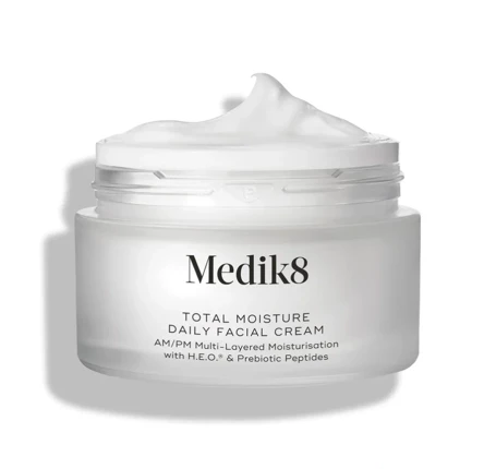 Крем Medik8 Total Moisture Daily Facial Cream — справжня знахідка для шкіри, яка страждає від зневоднення в осінньо-зимовий період. Він поєднує мультимолекулярну гіалуронову кислоту, пребіотичний пептид, кераміди й ліпіди, які відновлюють шкірний бар’єр, зміцнюють його і допомагають утримати вологу всередині клітин. Формула дуже збалансована: крем легкий, але водночас насичений, не залишає тяжкості чи жирного блиску, має приємну текстуру, що швидко вбирається. Ключові переваги: тривала дія зволоження (до 100 годин за незалежними клінічними дослідженнями), підтримка мікробіому шкіри і те, що він підходить як база під макіяж. Особливо цінно, що він без аромату, некомедогенний і має стильну можливість рефіллу, що зменшує вплив упаковки на довкілля.