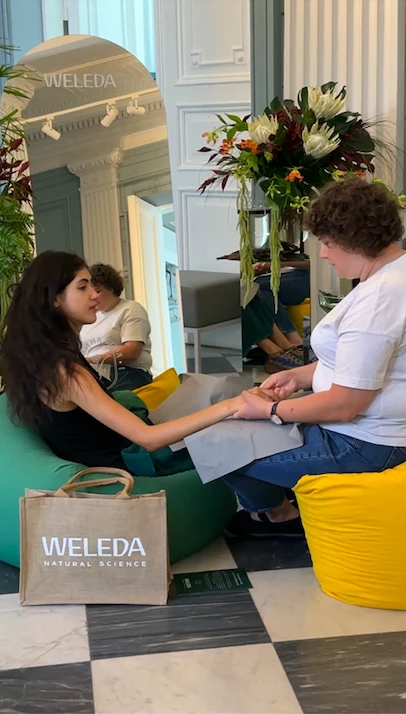 Weleda створила для моделей унікальний простір відновлення — Hands Relax Zone. Запрошені масажисти проводили 15-хвилинні релакс-масажі рук з використанням олій і кремів бренду. Цей короткий ритуал працював як медитація серед напруженого графіка показів, даруючи моделям відпочинок і турботу. Особливо цінною зона виявилася після безсонної ночі в Києві напередодні — дівчата отримали справжнє відновлення перед виходом на подіум.