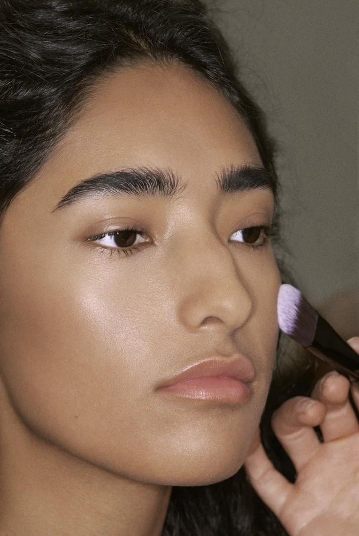 Щоб шкіра залишалась природно сяйливою, використали тональний флюїд Les Beiges Touche de Teint, який наносили пензлем, рухаючись від центру обличчя до периферії.