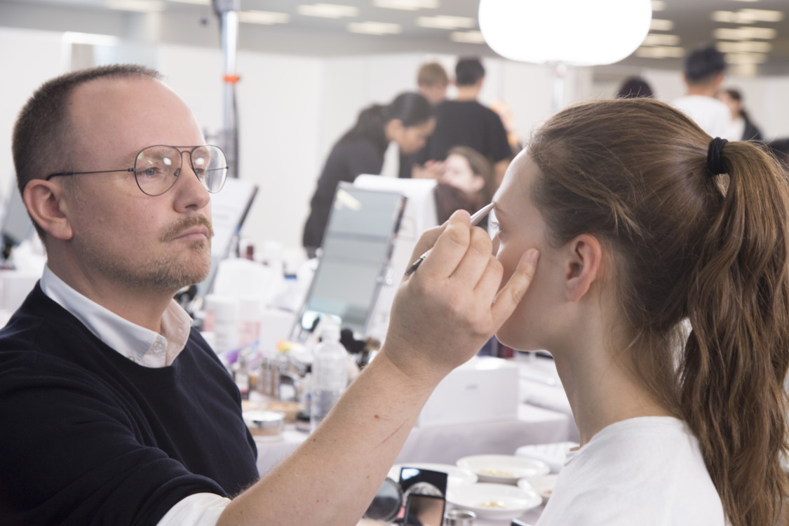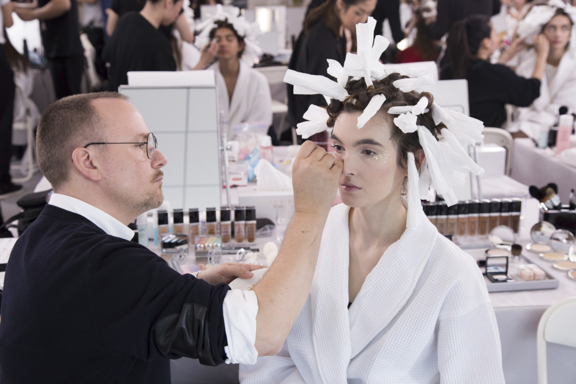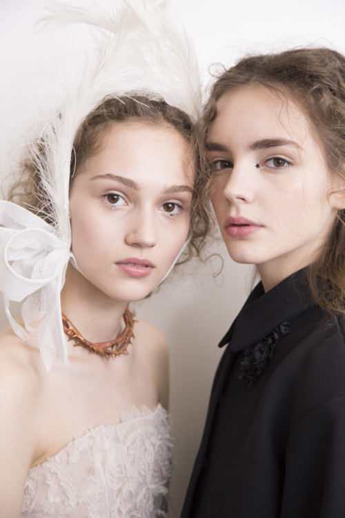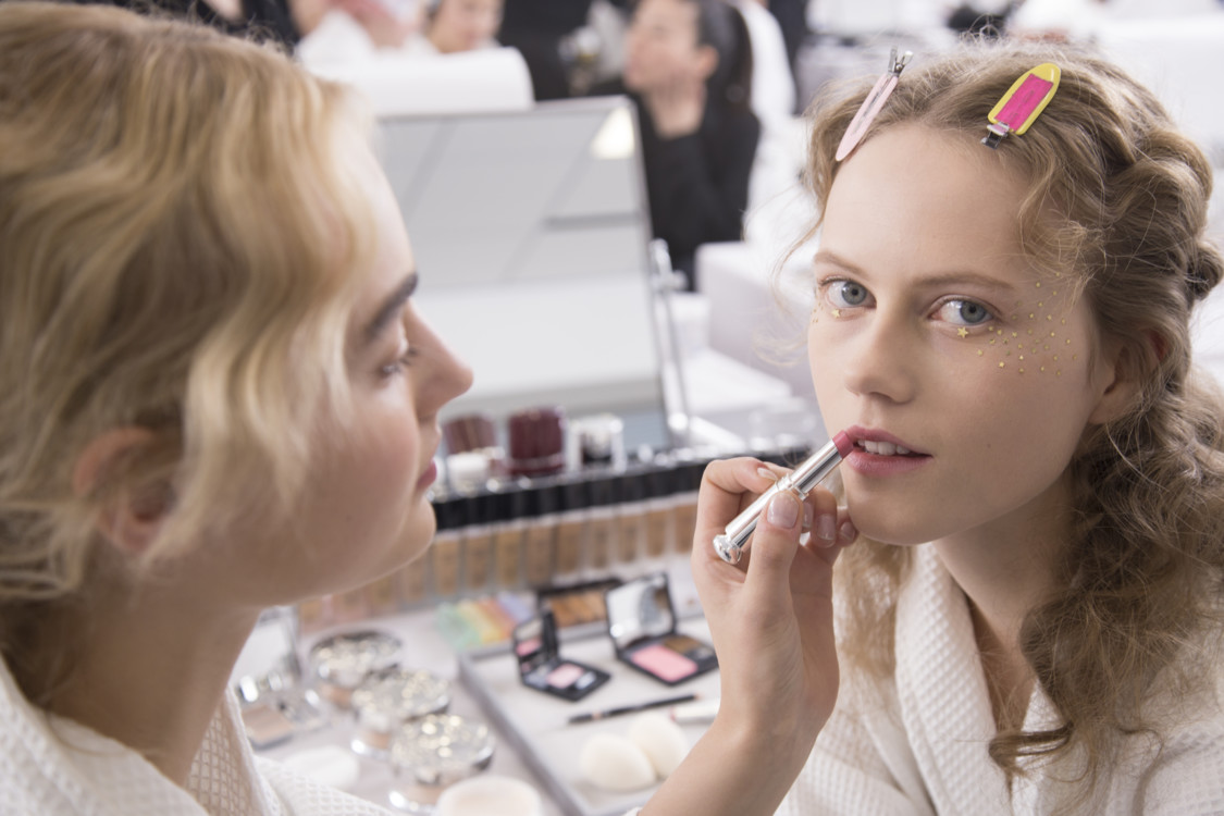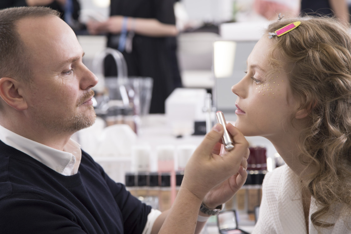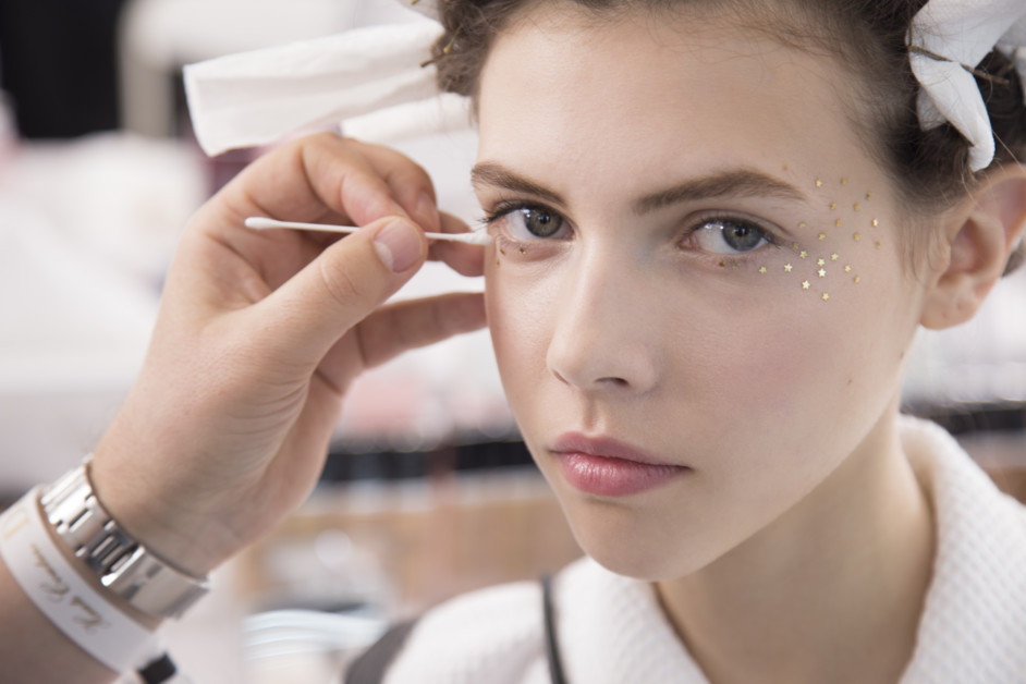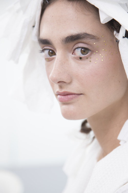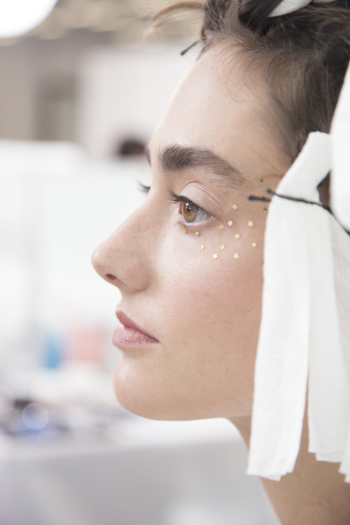 В качестве основы Питер Филипс нанес кушон Dior Forever Perfect Cushion, а щеки оживил мягким облаком румянца Diorblush в оттенках № 756 и № 876. Легкого прикосновения радужной пудры-хайлайтера Diorskin Nude Air Luminizer в оттенке № 001 хватило, чтобы получить жемчужное свечение в стратегических точках – лоб, переносица и ямочка купидона. Nude look на глазах без туши, выполненный бледно-бежевыми тенями Diorshow Mono в оттенке Backstage № 826 и бежевым карандашом Diorshow Khôl № 529, – идеальное комбо для звездного блеска. "Я создал несколько вариаций, чтобы подчеркнуть индивидуальность каждой девушки", – подметил Филипс. Одним моделям он наносил среднекрупный глиттер в виде "звездной пыли" (Dior Stardust) на верхние точки скул по направлению к вискам, другим выбрал крупные звезды-блестки, расставив по одной во внутреннем уголке глаза, третьим одинокие звезды поместил в центре нижнего века. Мягкость и гладкость губы обрели благодаря новому сахарному бальзаму-скрабу для губ, чувственность которых Питер Филипс усилил легким прикосновением блеска Dior Addict Lacquer Stick (оттенок Tease № 550) в центре нижней губы: "Сливочная текстура и незаметный блеск придают губам пухлость и объем", – так Филипс объяснил этот трюк. Достойный мировых фестивалей макияж, но в изящном кутюрном воплощении, завершали "прерафаэлитские" прически Гвидо Палау – вьющиеся длинные волосы, спадающие по плечам, либо взбитые в облако и собранные назад кудри.