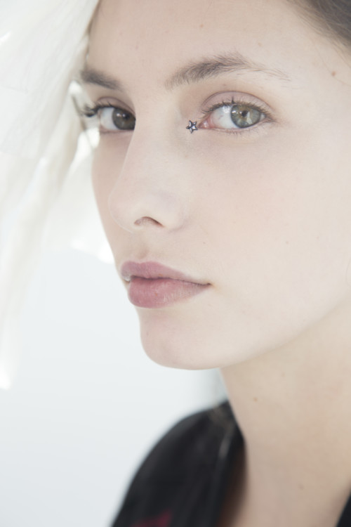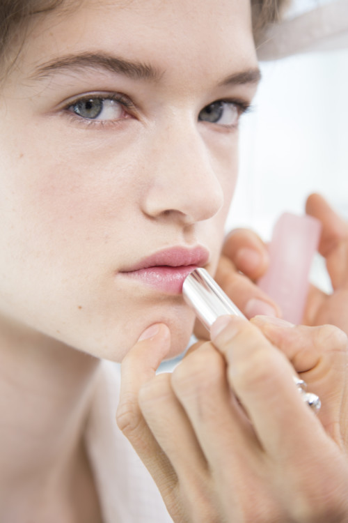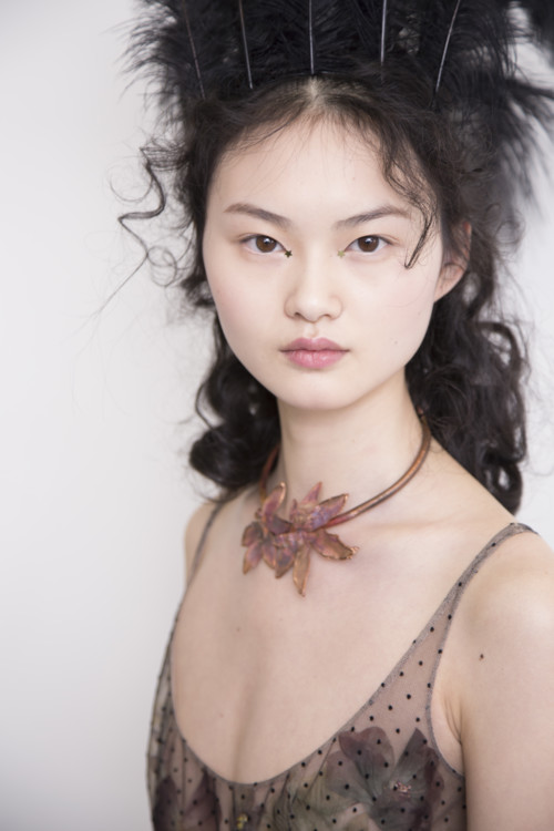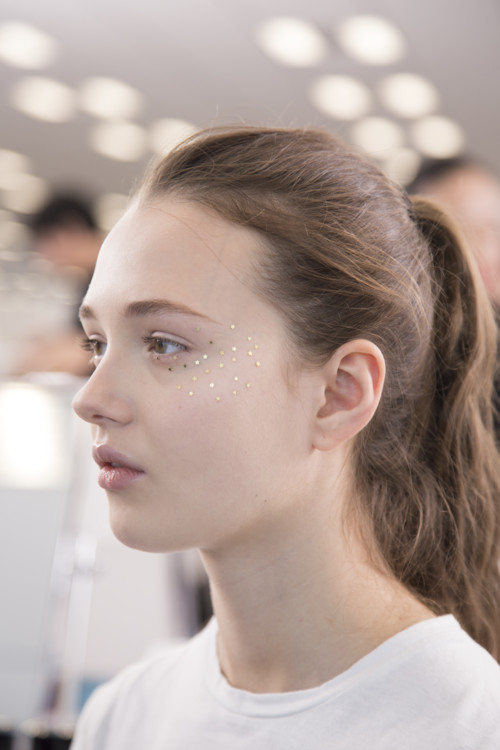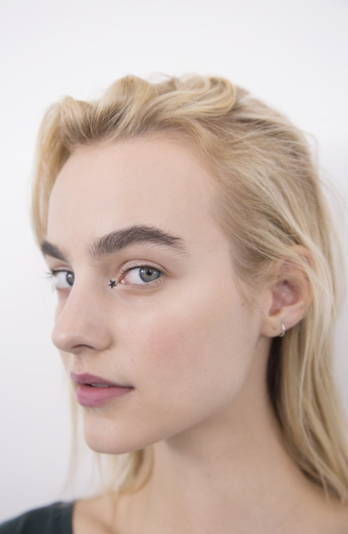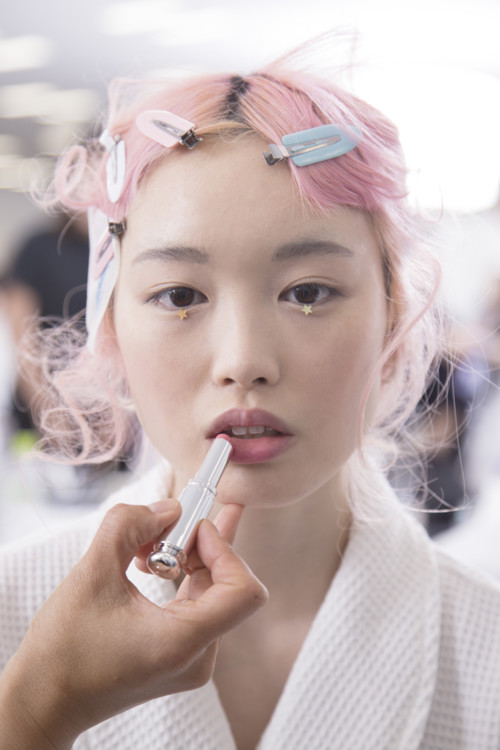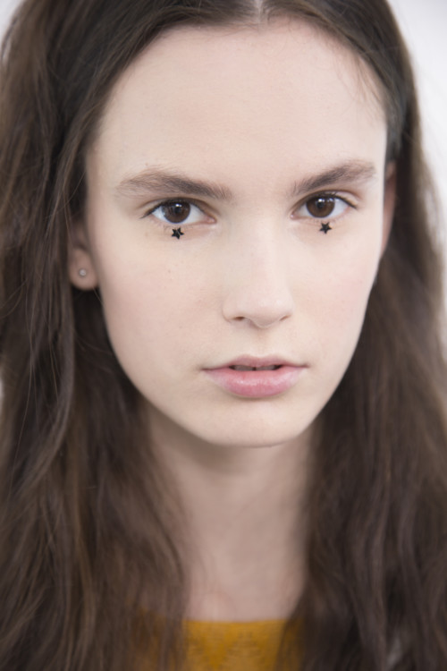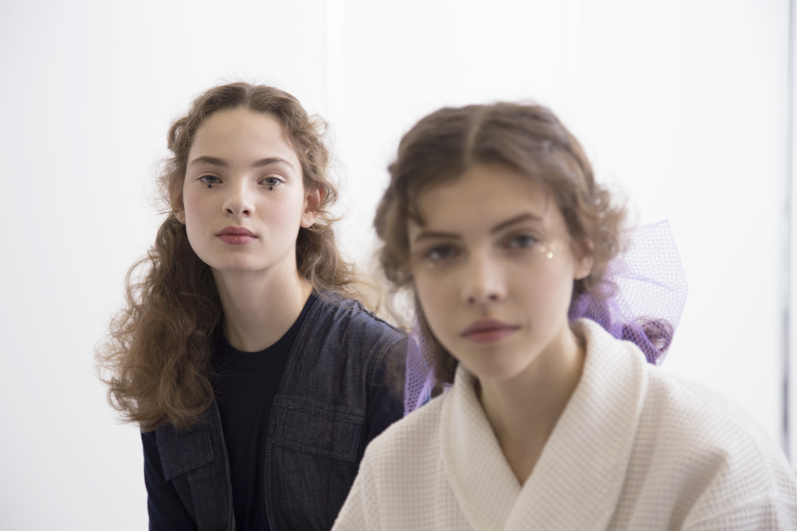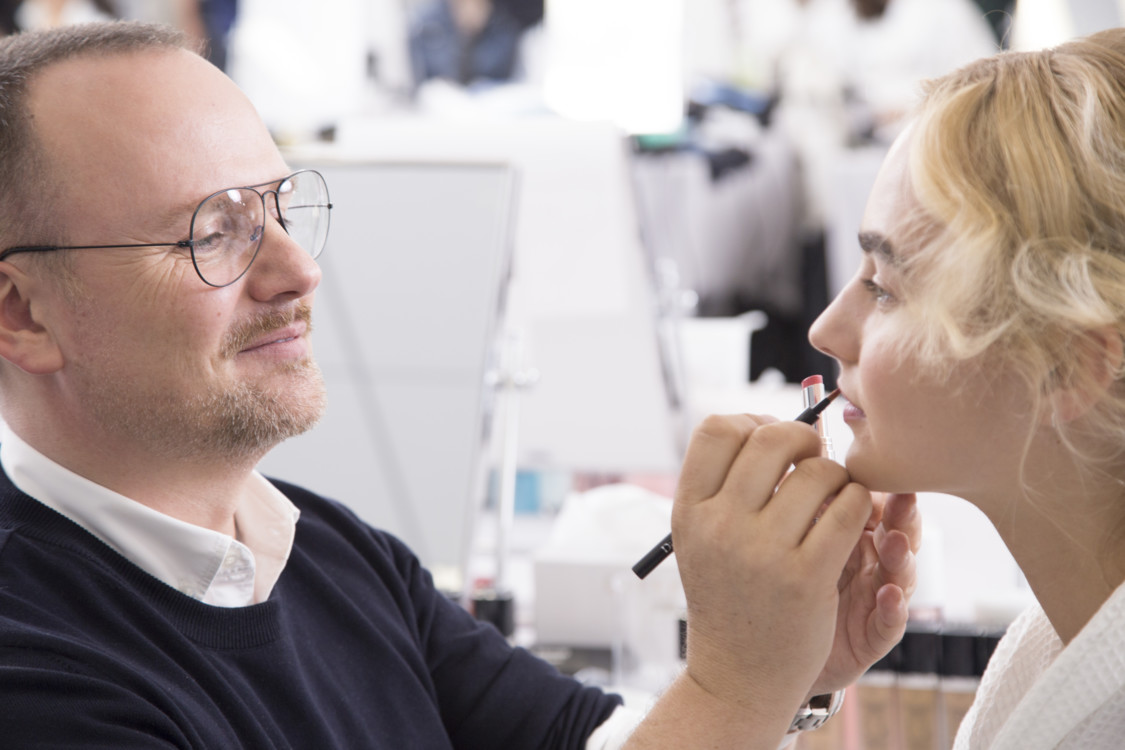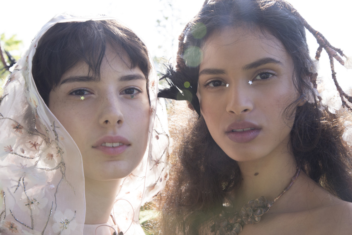 В качестве основы Питер Филипс нанес кушон Dior Forever Perfect Cushion, а щеки оживил мягким облаком румянца Diorblush в оттенках № 756 и № 876. Легкого прикосновения радужной пудры-хайлайтера Diorskin Nude Air Luminizer в оттенке № 001 хватило, чтобы получить жемчужное свечение в стратегических точках – лоб, переносица и ямочка купидона. Nude look на глазах без туши, выполненный бледно-бежевыми тенями Diorshow Mono в оттенке Backstage № 826 и бежевым карандашом Diorshow Khôl № 529, – идеальное комбо для звездного блеска. "Я создал несколько вариаций, чтобы подчеркнуть индивидуальность каждой девушки", – подметил Филипс. Одним моделям он наносил среднекрупный глиттер в виде "звездной пыли" (Dior Stardust) на верхние точки скул по направлению к вискам, другим выбрал крупные звезды-блестки, расставив по одной во внутреннем уголке глаза, третьим одинокие звезды поместил в центре нижнего века. Мягкость и гладкость губы обрели благодаря новому сахарному бальзаму-скрабу для губ, чувственность которых Питер Филипс усилил легким прикосновением блеска Dior Addict Lacquer Stick (оттенок Tease № 550) в центре нижней губы: "Сливочная текстура и незаметный блеск придают губам пухлость и объем", – так Филипс объяснил этот трюк. Достойный мировых фестивалей макияж, но в изящном кутюрном воплощении, завершали "прерафаэлитские" прически Гвидо Палау – вьющиеся длинные волосы, спадающие по плечам, либо взбитые в облако и собранные назад кудри.