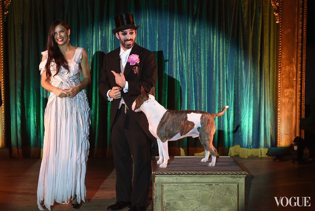 Презентация превратилась в полноценный перфоманс: на сцене Джейкобс устроил иллюзион с фокусниками, которые прямо на глазах у публики "распиливали" на две части Адриану Лиму. В представлении принял участие и небычный артист – любимая собака дизайнера. Бультерьер Нэвил Джейкобс (именно так дизайнер назвал своего пса) – звезда соцетей: у него есть свой аккаунт в инстаграмме, за которым следит больше 200 тысяч подписчиков.