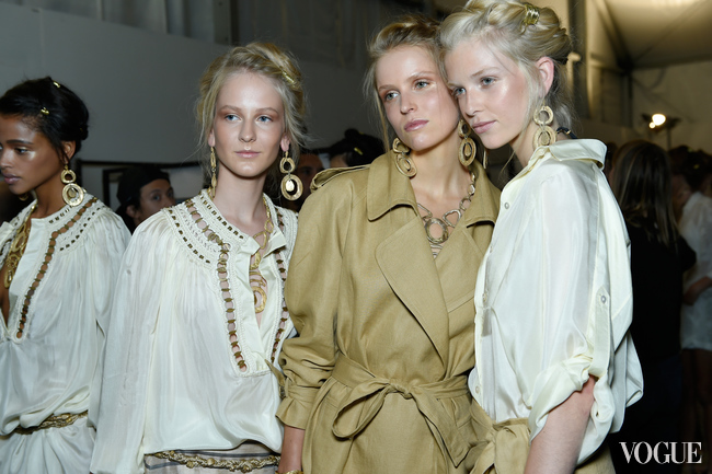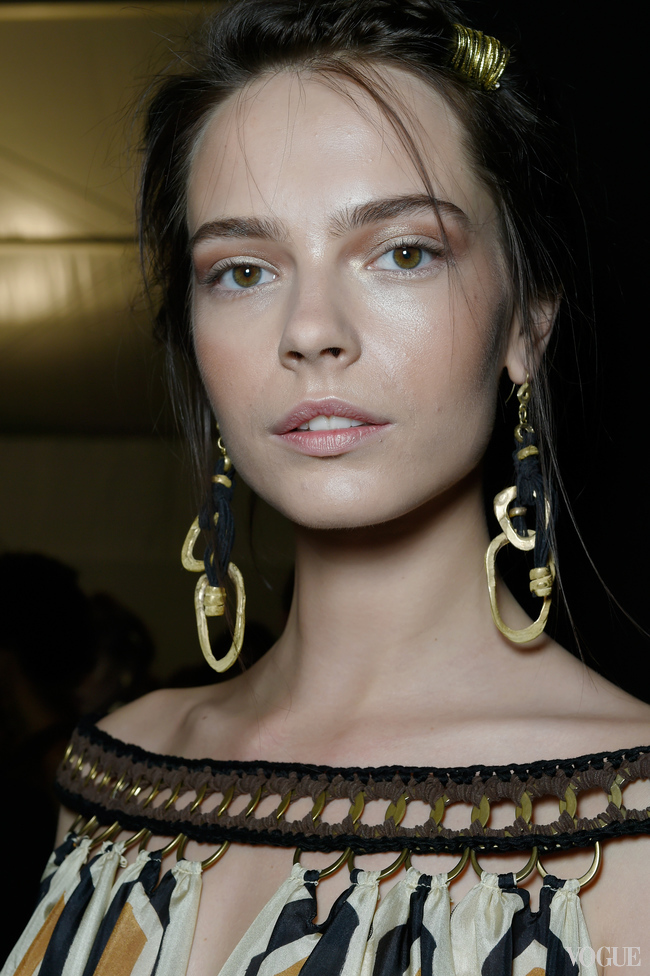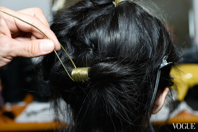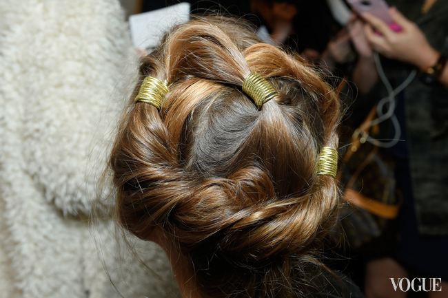 Нечто от античных богинь было и в прическах, которые соорудил Гвидо Палау. Прежде чем скрутить локоны в мягкие роллы-жгуты, закрепляя их хаотично в форме венца, он нанес на волосы спрей Redken Wind Blown 05, который формирует прическу, придает прядям объем и текстуру. Финальным штрихом послужили золотые нити, которыми были обернуты локоны в случайном порядке. "Это ссылка на прически поздних 70-х и ранних 80-х, – пояснил Палау. – Когда во многих коллекциях, вдохновленных темой пустыни, были золотые акценты".