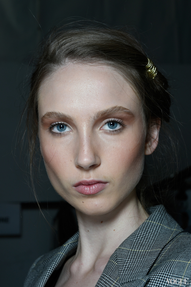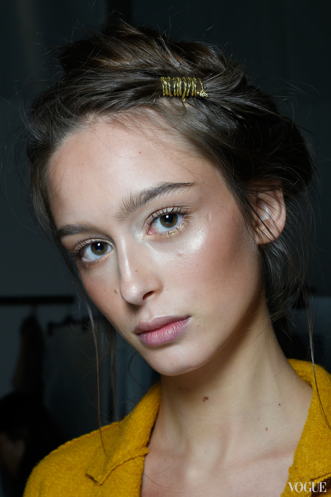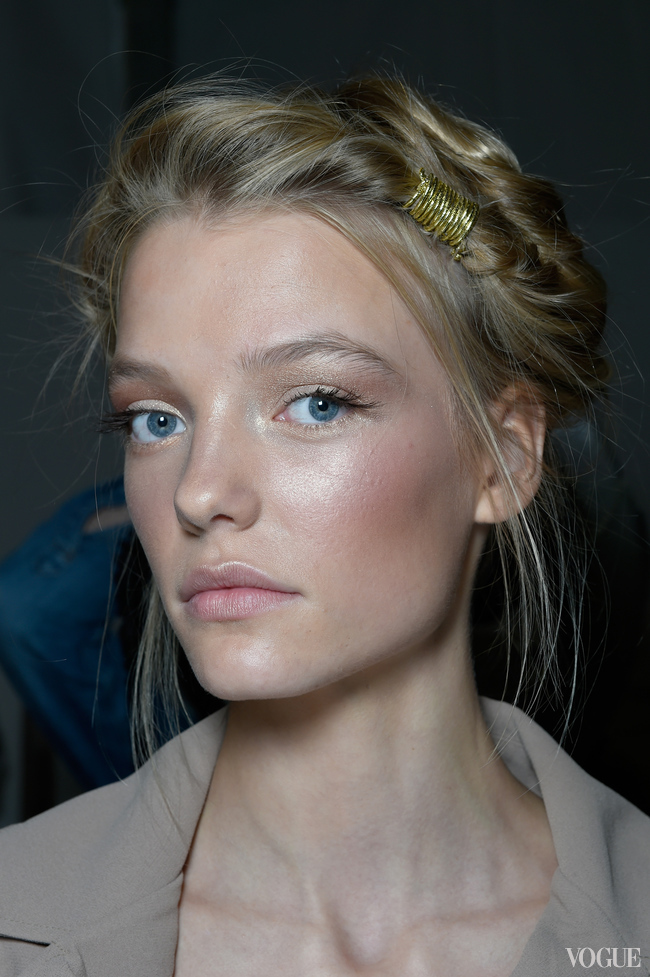 Такого золотого эффекта она добилась благодаря перламутровым текстурам с вкраплениями античного золота и меди. Одним моделям она наносила бронзирующую пудру в золотом оттенке MAC Cosmetics Bronzing Powder на веки до самых бровей и во внешние уголки глаз, расставляя акценты в центре рта и на переносице хайлайтером Cream Colour Base в лунном и персиково-розовом тонах.