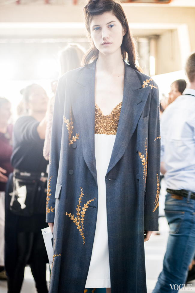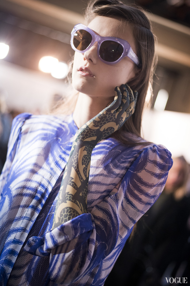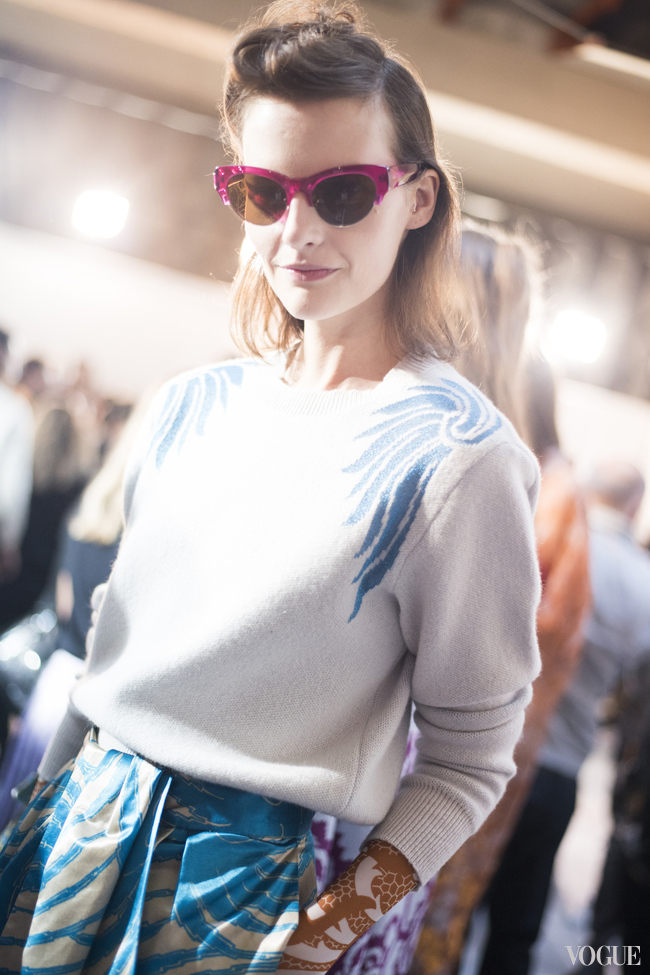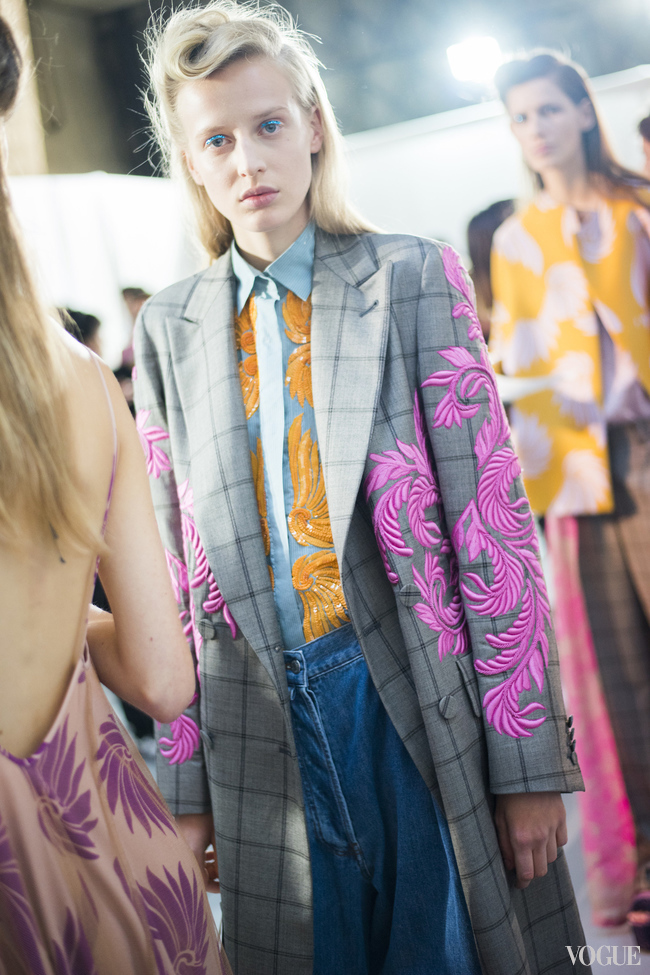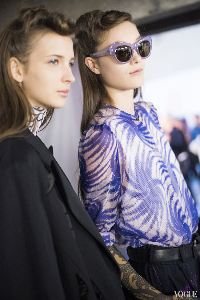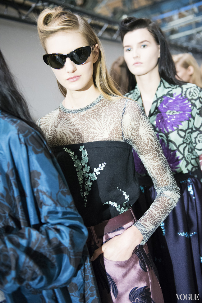 Стилист Сэм Макнайт, работавший за кулисами показа Dries Van Noten весна-лето 2016, вспоминает эпоху 40-х и сооружает на головах моделей прически в стиле тревожных времен Второй мировой войны.