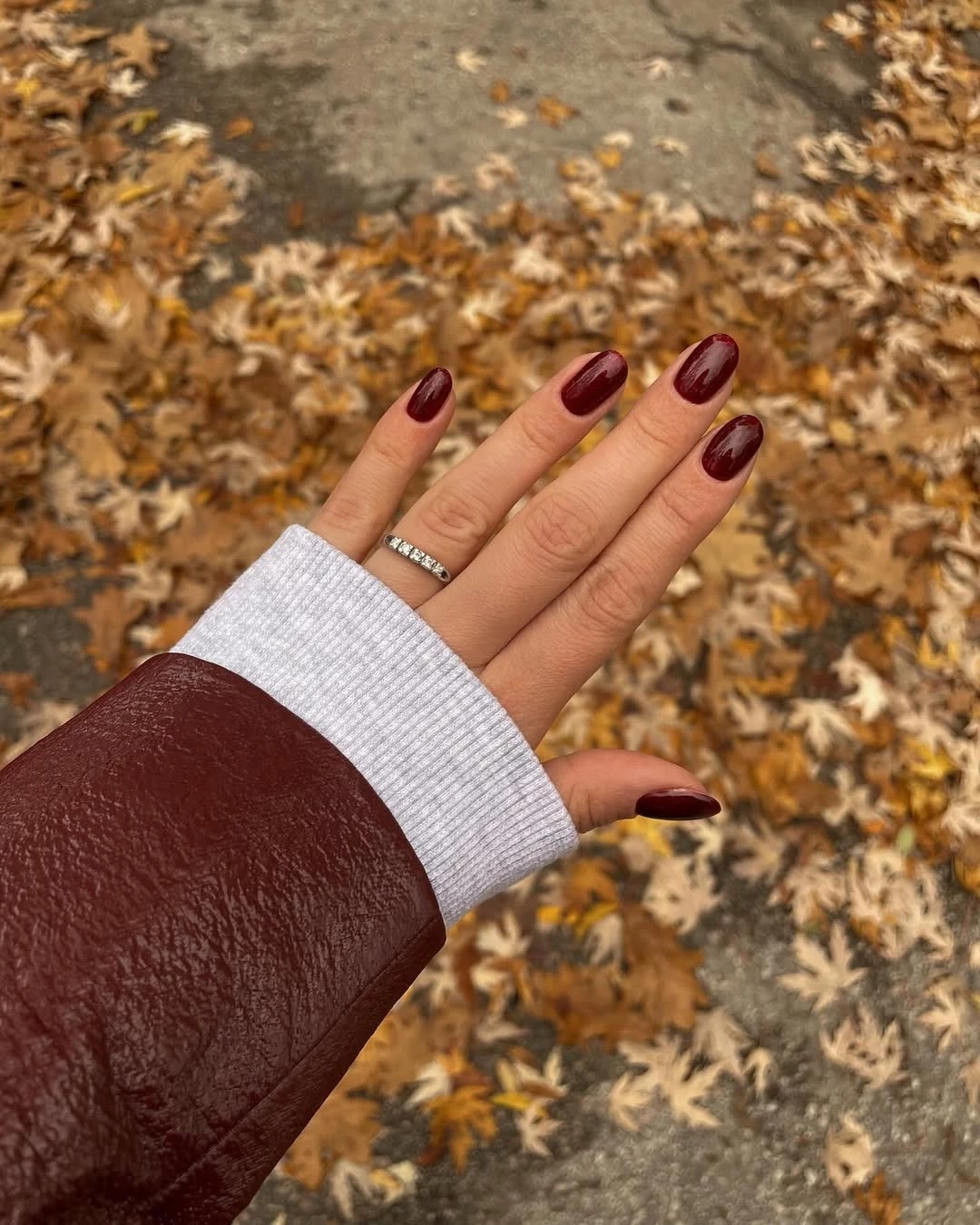 Глибокий червоно-винний — класика осіннього сезону. Елегантний і вишуканий, але з характером. Найкращий вигляд має на коротких, злегка квадратних нігтях, створюючи вишуканий ефект без надмірної драматичності.