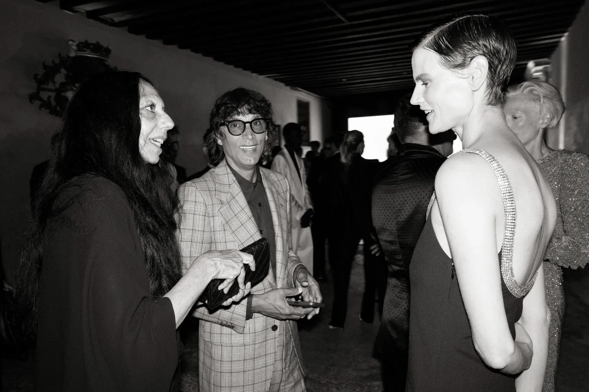 Цей дух стриманої елегантності відчувався і на самому заході: серед гостей були Кейт Мосс, Періс Джексон, Індія Мур, Саскія де Брау та Нумі Рапас, яких пригощали шампанським та замороженою горілкою (улюбленим напоєм Гайдера Акермана). Переважна кількість гостей була вдягнена в речі з першої колекції дизайнера для Tom Ford, яку він показав у березні. Продовжився вечір імпровізованою фотосесією Грега Вільямса в розкішних інтер'єрах палаццо, а за режисуру відповідала сама Кейт Мосс. Далі була вечеря, на якій подавали смаженого сібаса та тірамісу від шеф-кухарів родини ресторанів Alajmo, відзначених зірками Мішлен.