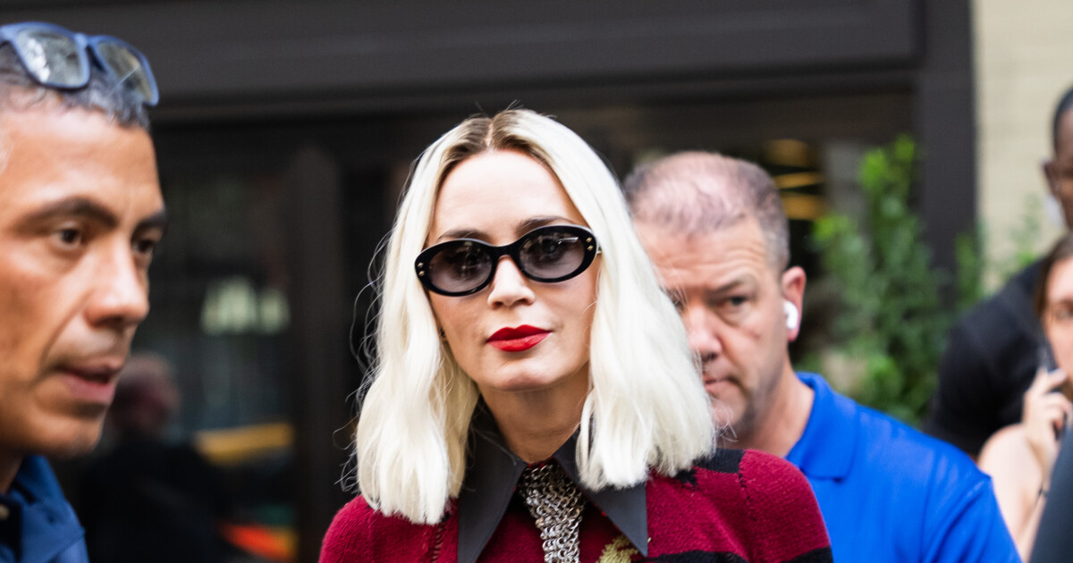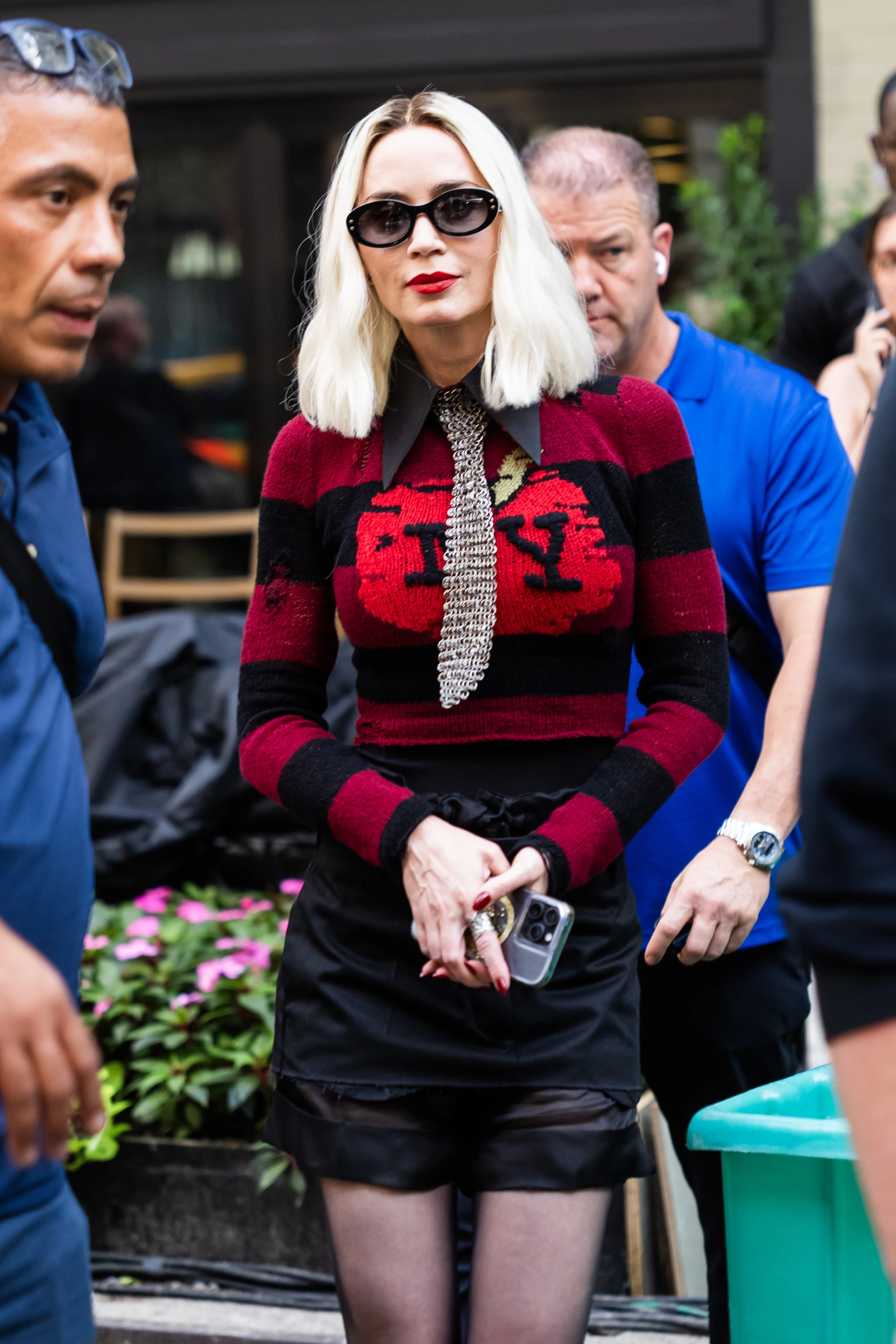 За кольоротипом Блант належить до "чистого літа" з холодними підтоном, що дозволяє їй вдало носити приглушені, прохолодні відтінки: світлі каштанові, попелясті блонди й крижано-білі блонди. Та нинішній образ став її найрадикальнішим експериментом. На нових фото акторка постає в образі Емілі Чарлтон із блискучим платиновим каре до плечей з темними коренями, які створюють драматичний контраст. Видається, персонажка влилася до лав знаменитостей, які обрали модне каре і, як завжди, робить це максимально ефектно. Щодо решти образу: чорний і червоний смугастий светр Coach, чорна спідниця Maison Margiela, прозорі чорні колготки, кольє-ланцюг і платформні лофери Gianvito Rossi. Доповнили аутфіт чорні окуляри Dior та яскраво-червона помада.