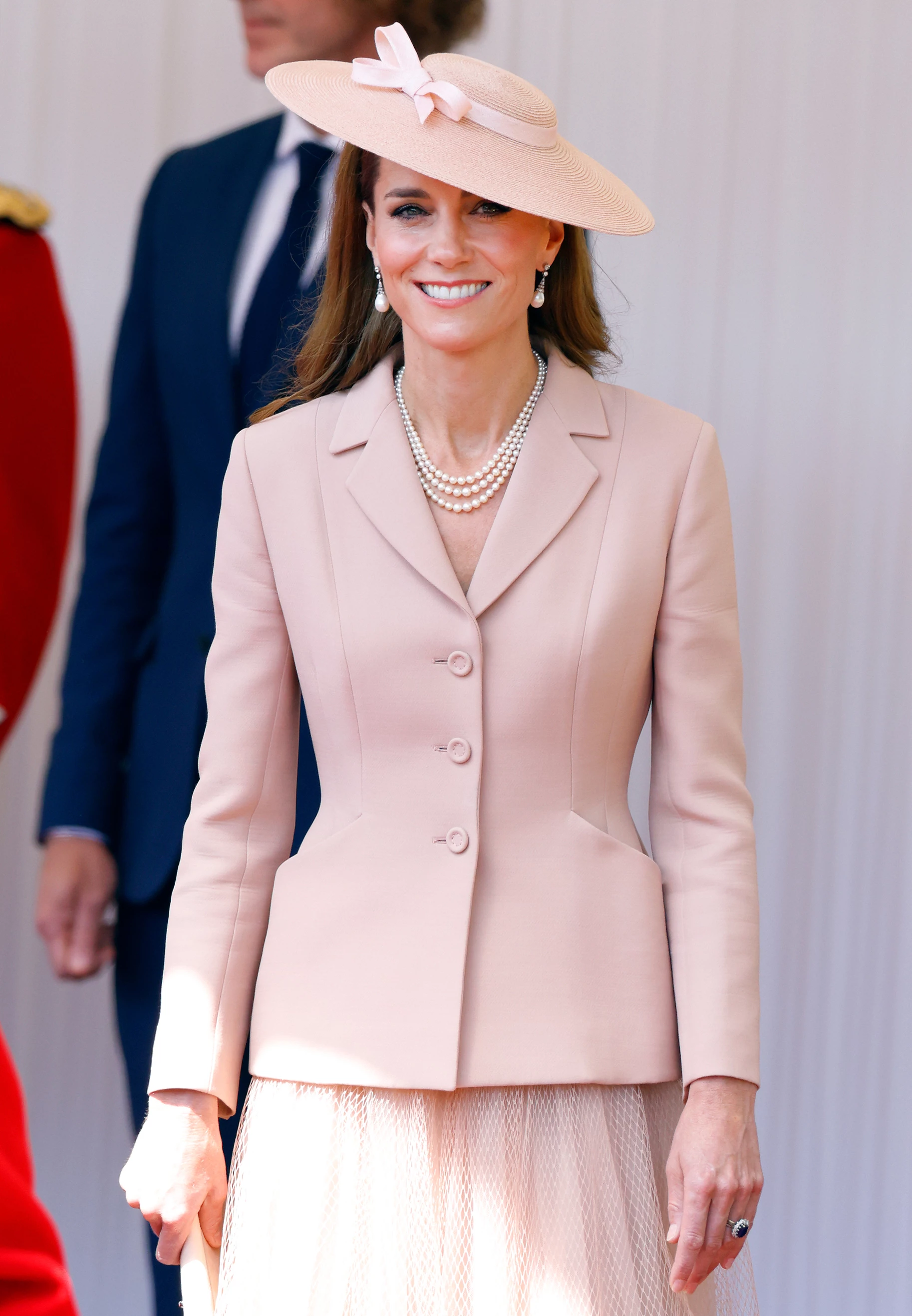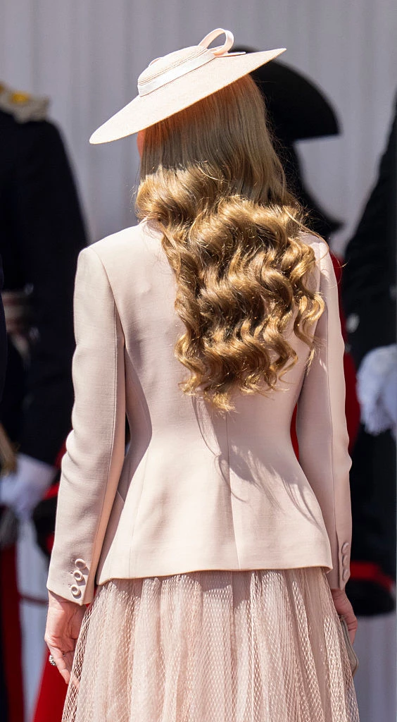 Ще взимку Кейт трохи освітлила волосся, але тепер демонструє найсвітліший відтінок за весь час. Honey Bronde (медовий бронд) має ідеальний баланс між блондом і каштаном. Залежно від освітлення волосся може виглядати як блондинисте, так і як шатен. Це особливо помітно на останніх фото з офіційного заходу французького президента в Уельсі. На сонці її волосся сяє теплим медовим кольором із золотистими нотами, а в непрямому світлі має середньо-каштановий відтінок із м’якими світлими відблисками.
