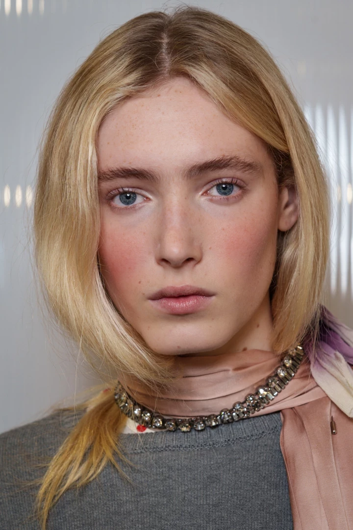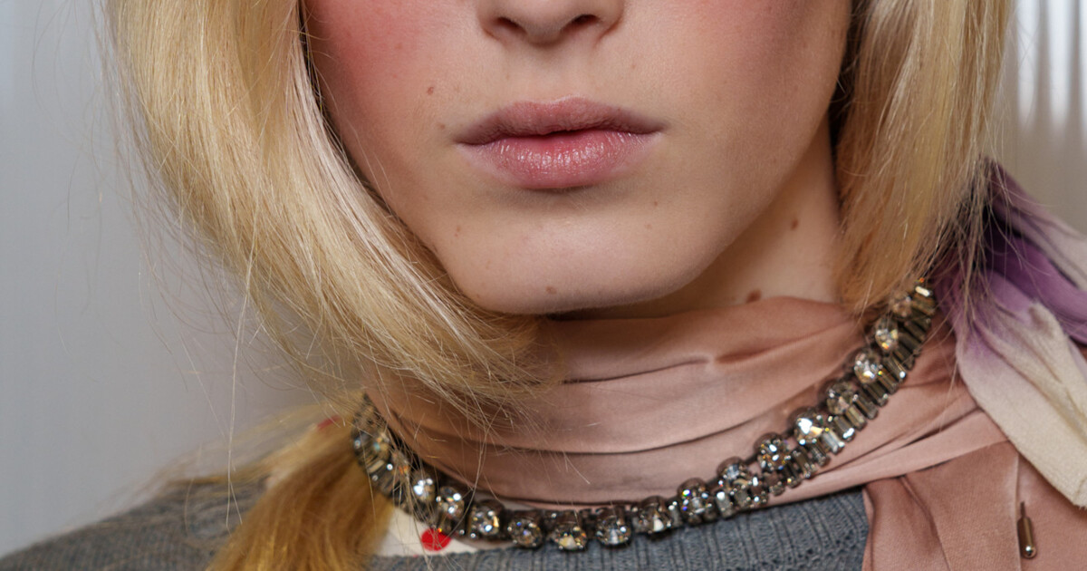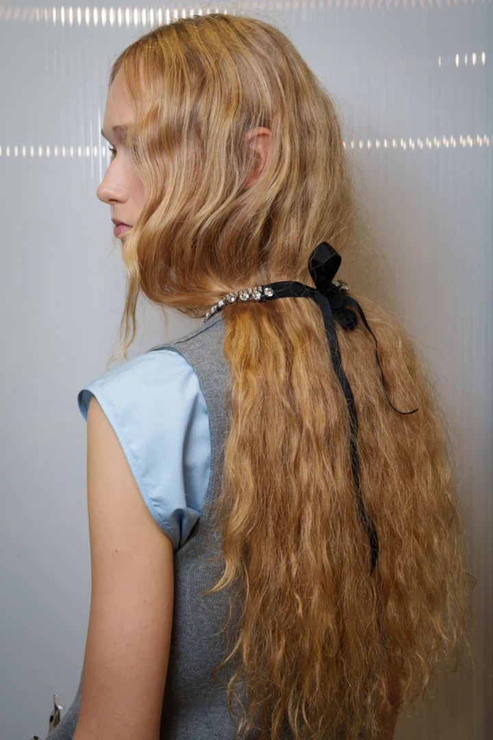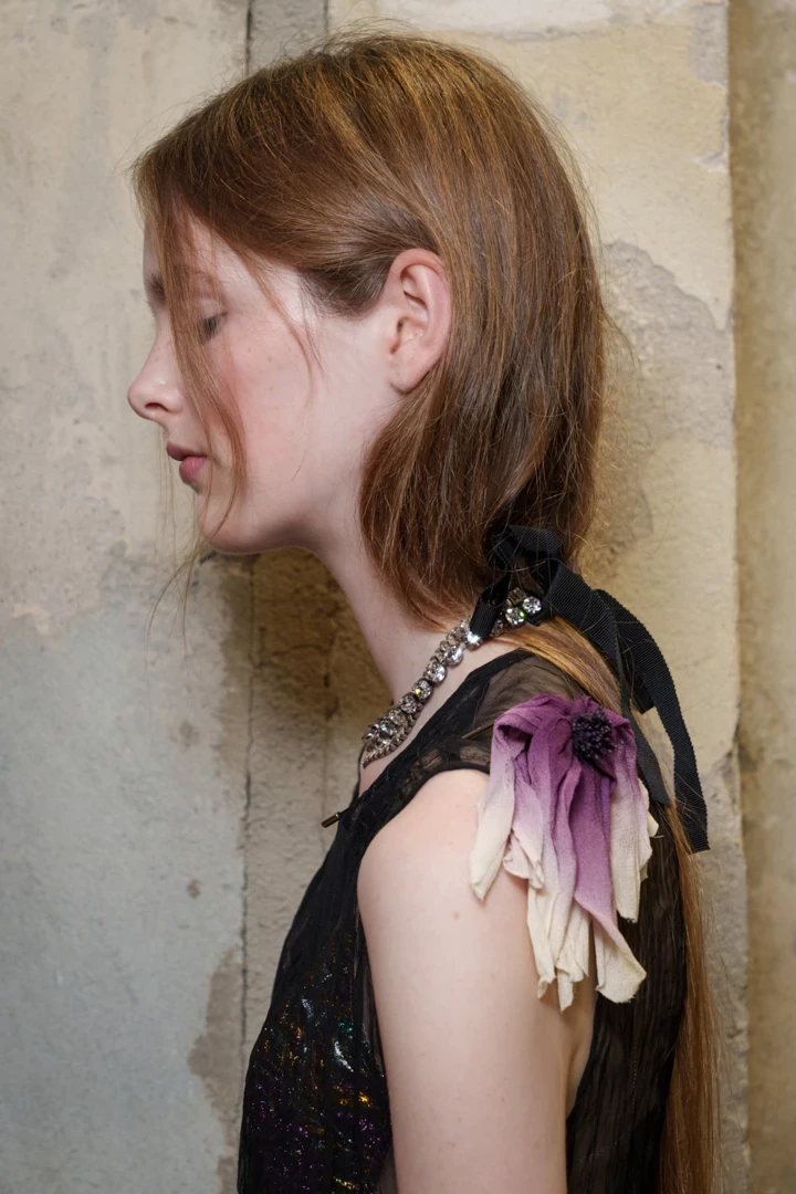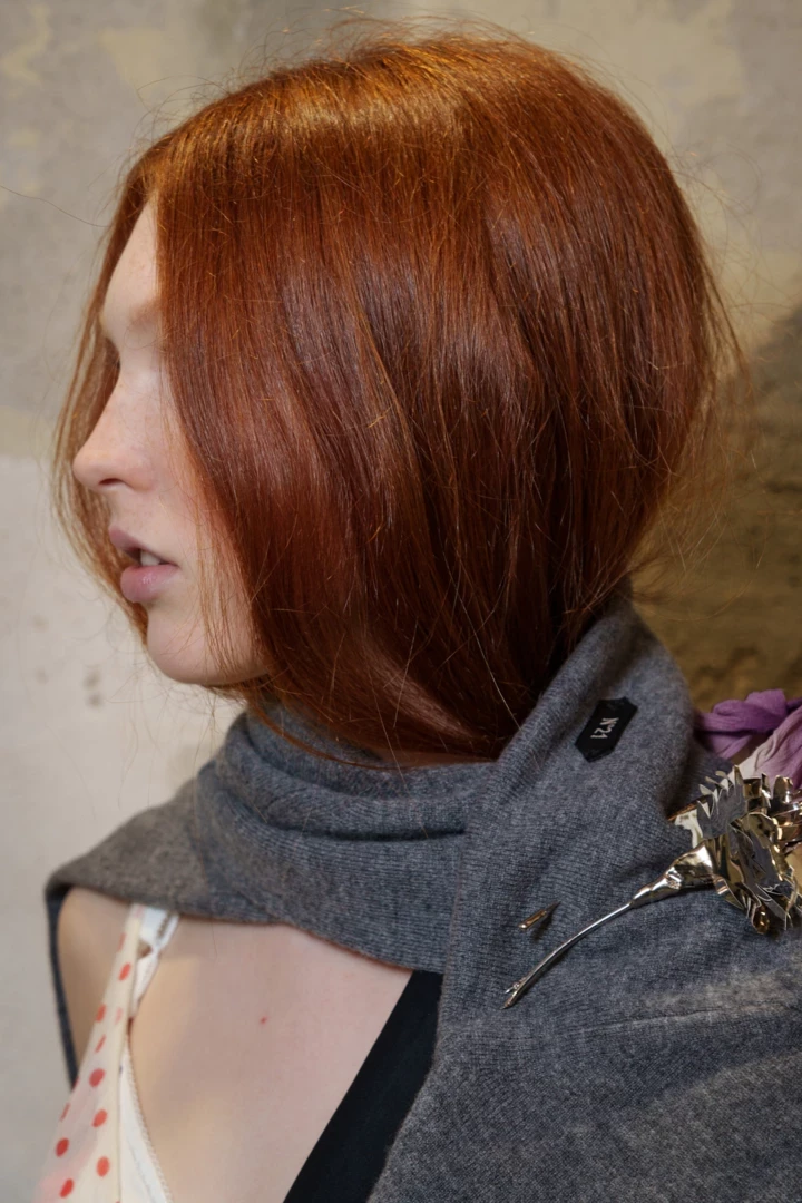 Мікротренд "турботлива" зачіска — це прийом, який голосно прозвучав на шоу N°21: довжину волосся "підбирають" і акуратно заправляють під прикрасу на шиї — чокер, масивне намисто чи стрічку. Візуально це дає ефект м’якого faux bob: лінія волосся підіймається вище ключиць, силует стає графічним, а образ — легшим. По суті, це еволюція колишнього hair tuck (коли пасма ховали під комір гольфа), лише у цікавішому виконанні. При цьому волосся надійно сховане від вологи, холоду та вітру під верхнім одягом.