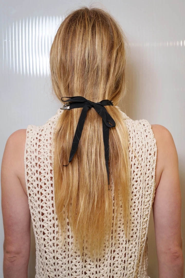 Якщо потрібен м’якший варіант, замість металу пасуватиме вузька шовкова стрічка чи мінішарф: її зав’язують довкола шиї, підхоплюючи хвіст і притискаючи довжину до потилиці — стрічка фактично бере на себе функцію "чокера", після чого гумку можна послабити або зняти.