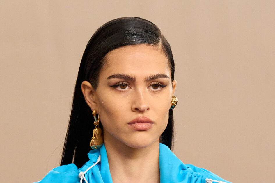 Волосся зачісується назад із боковим нахилом та створює контраст між контролем, блиском і природною вологістю. Такі бренди, як Loewe, Hermès і Celine, пропонують чисту та сучасну конструкцію, що додає стильності весняно-літнім образам.