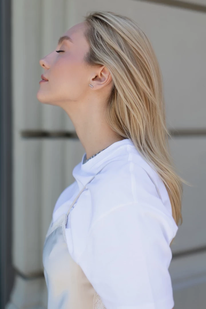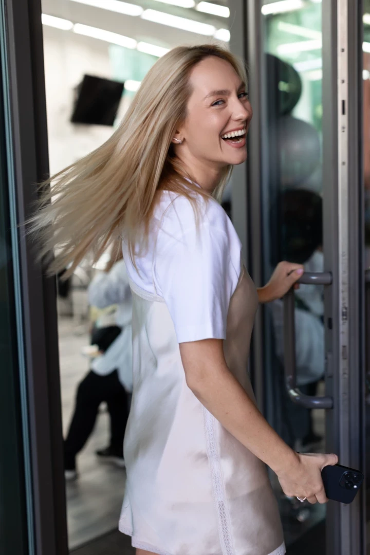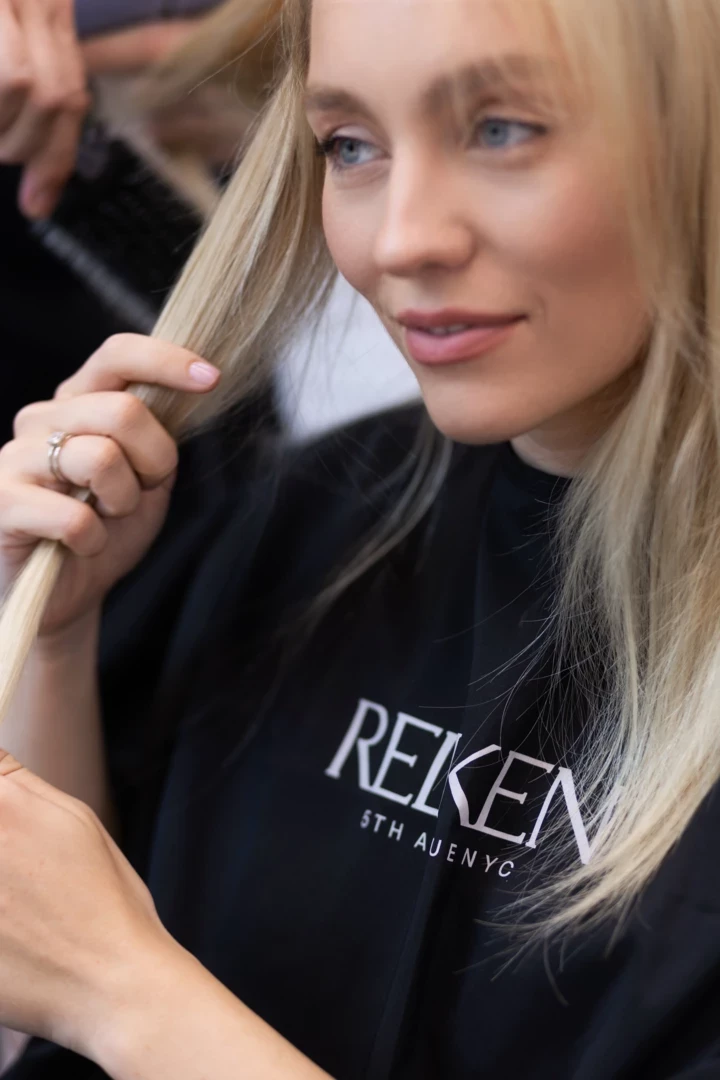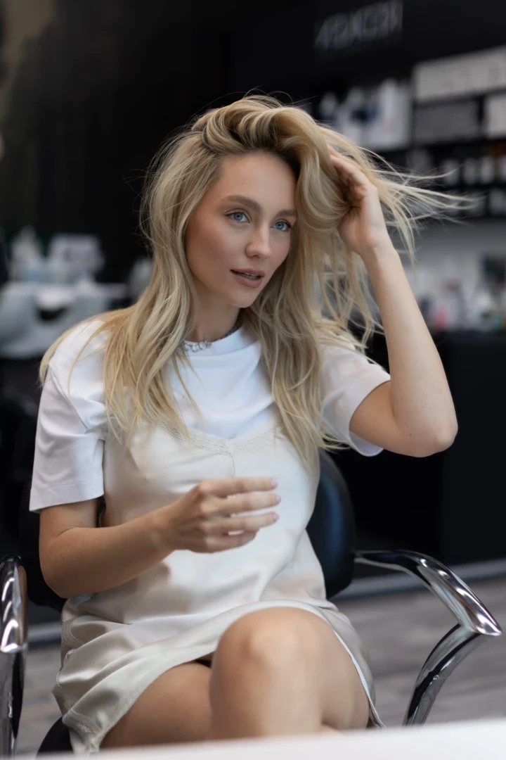 На цьому етапі питаємо ROXOLANA, як відчувається волосся. "Ну дуже приємне", – щиро зізнається вона і дозволяє доторкнутися. Пасма гладкі, як атлас. – "Волосся ніжне-ніжне і не важке. А є ще один нюанс. Зазвичай, коли робиш догляд, він обтяжує волосся. А тут такого немає. Тут воно легеньке, повітряне, прикольне".