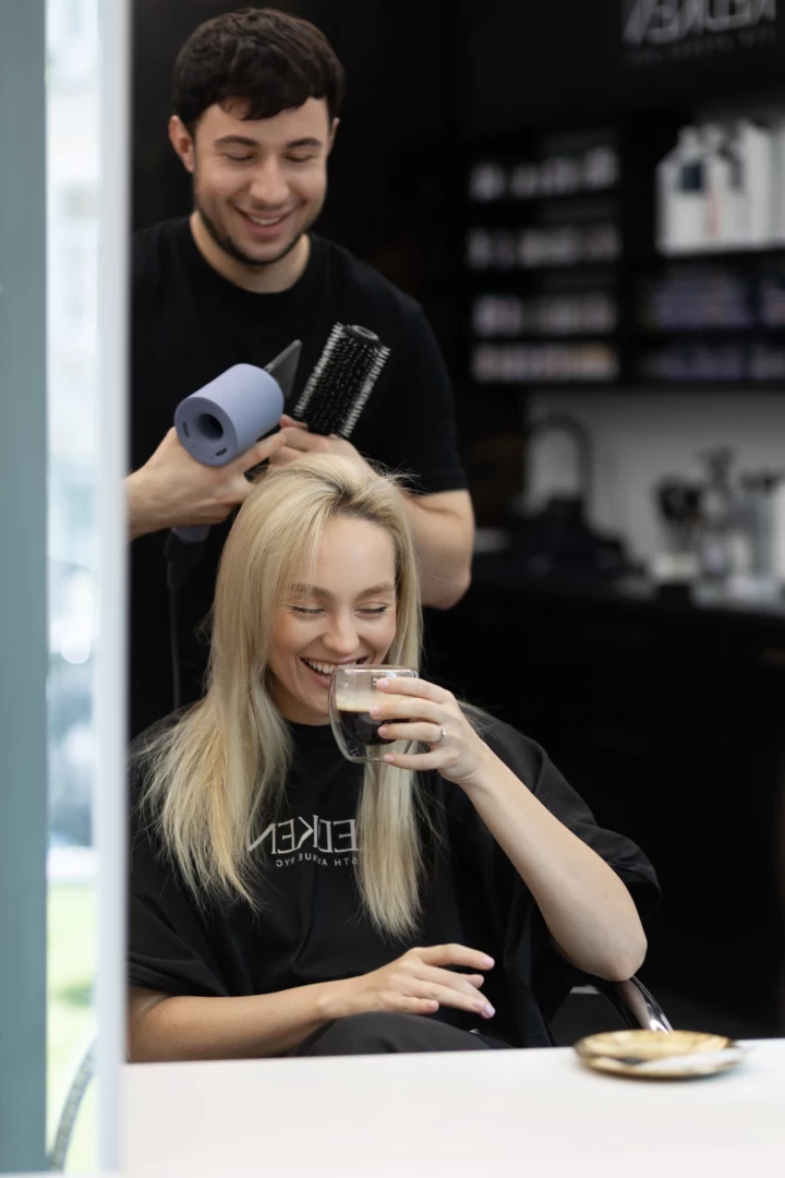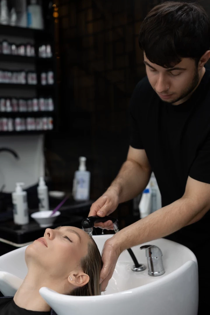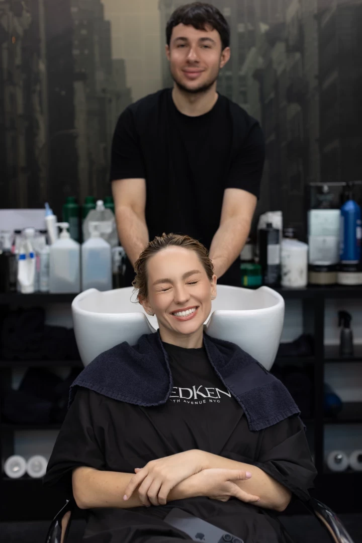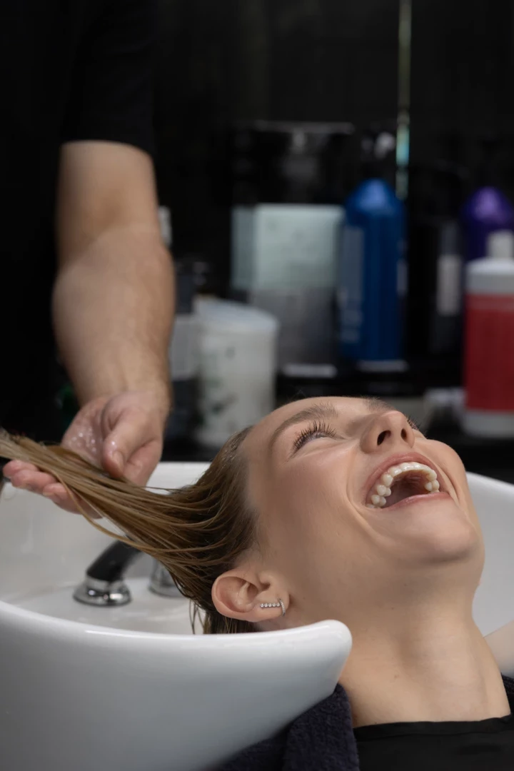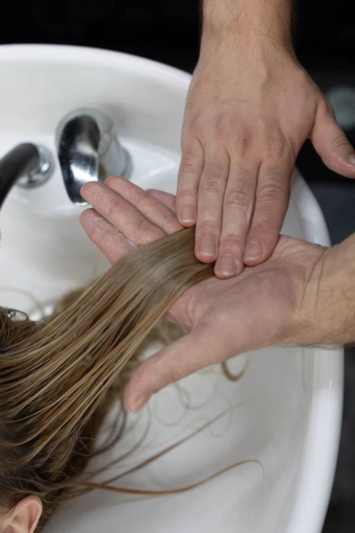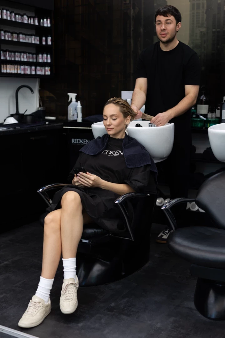"Будь-яке освітлення пошкоджує волосся, тому, окрім щоденного догляду, варто принаймні раз на місяць робити салонний догляд", – пояснює Влад. Масажними рухами він наносить шампунь з лінії для фарбованого волосся, який спрямований на те, щоб надати йому сяйва. Роксолана щасливо мружиться, поки шампунь перетворюється на пишну піну.