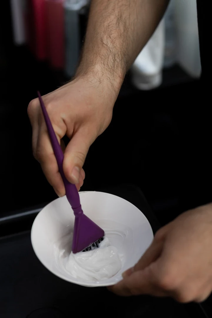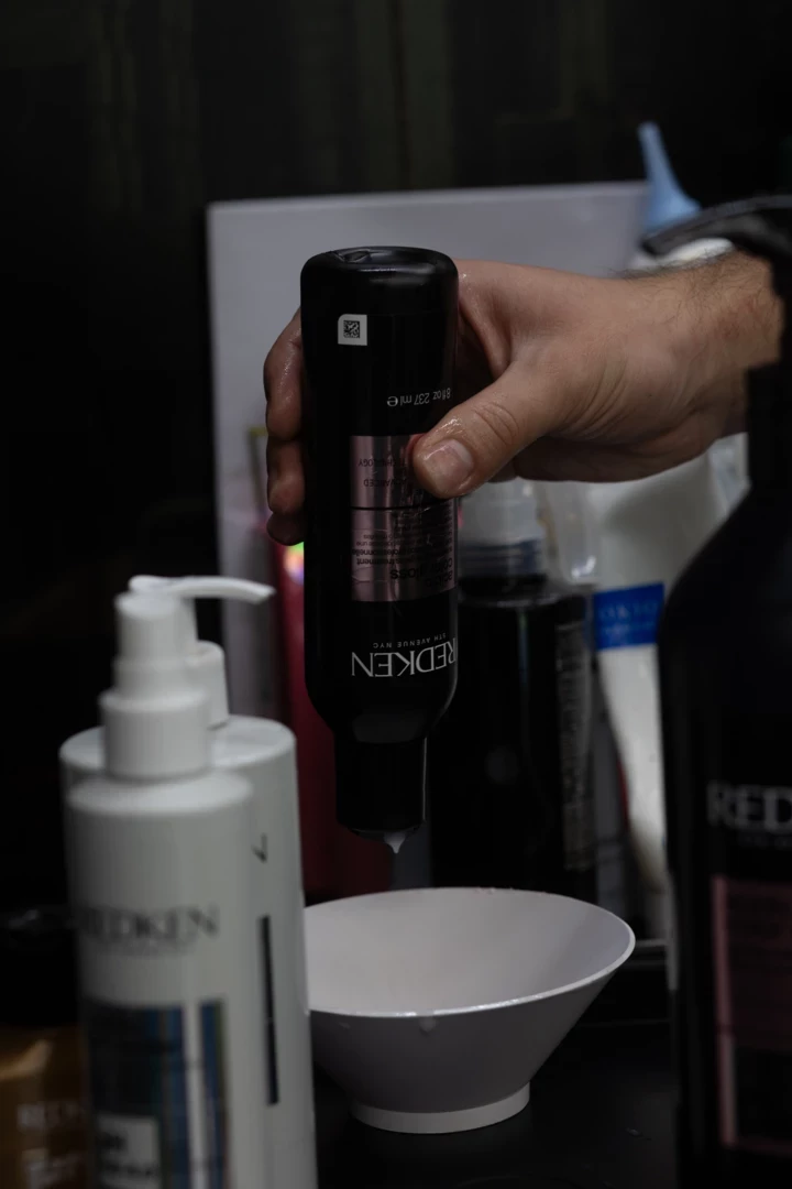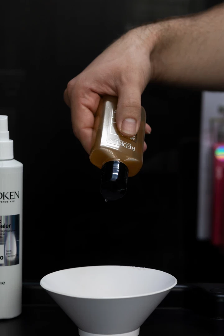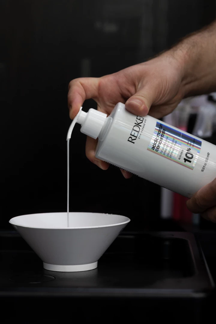Влад Онойко змішує професійний засіб для освітленого пошкодженого волосся Acidic Moisture Concentrate та олію з арганою All Soft Argan 6, щоб максимально зволожити, наповнити ліпідами і відновити волосся. Влад не радить повторювати подібні трюки вдома: дуже легко в домашніх умовах наплутати з пропорціями – і в результаті позбавити волосся об’єму, переобтяжити та зробити його, замість блискучого та легкого, тьмяним.
