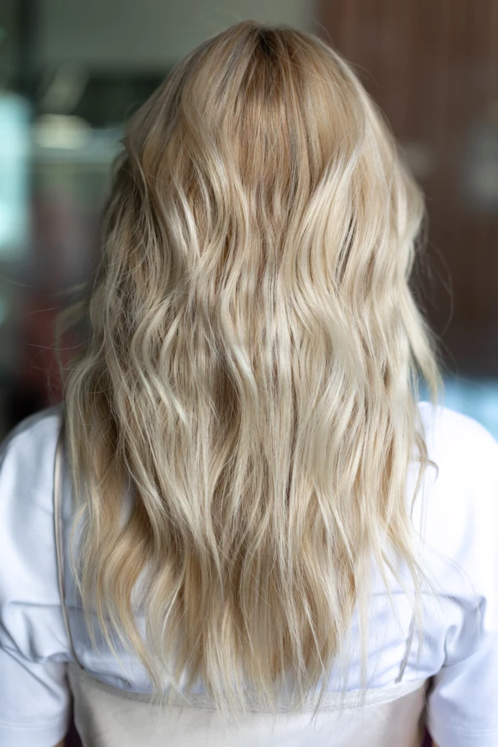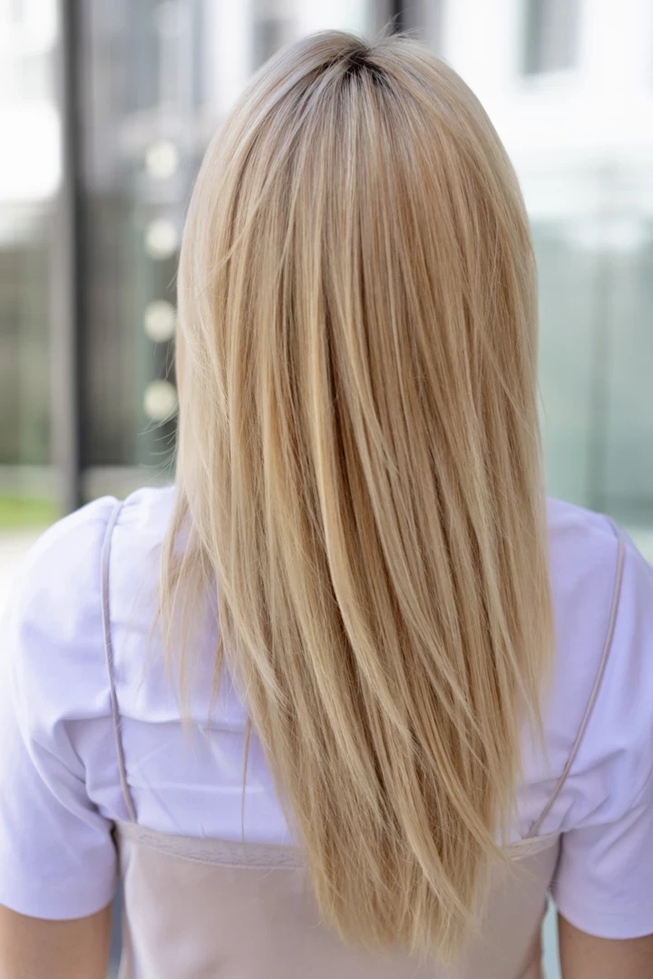 Спочатку робимо фото ДО. Волосся ROXOLANA – густе, освітлене, пряме, передбачувано схильне до сухості на кінчиках.