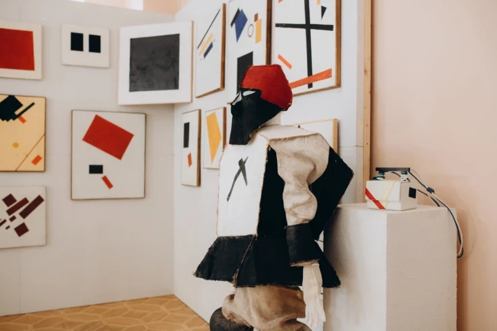 Експонати, які побачать відвідувачі, — це не лише відтворення робіт Малевича, а й реквізит зі знімального майданчика довгоочікуваного художнього фільму "Малевич" режисерки Дарії Онищенко. Співпраця між командою фільму та Театром Франка виникла органічно, адже у кінострічці знялися його провідні актори. У головній ролі Казимира Малевича — актор Віталій Ажнов. Також у стрічці грають Олександр Рудинський, Марина Кошкіна, Христина Корчинська та інші.