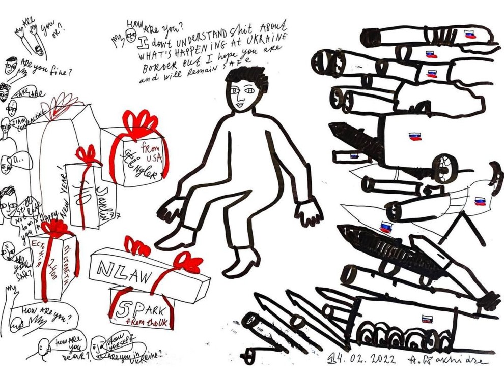 Автор – Алевтина Кахідзе (Фото – @artists.support.ukraine)"Перші три дні проєкт робився правою рукою та голосовими повідомленнями, поки лівою я вела машину на Захід. Нині я в Ужгороді в порівняній безпеці. За ці 10 днів різної роботи й допомоги я зрозуміла, що треба й далі робити те, що робиш найкраще. Я розумію, що можу бути ефективнішою у своєму професійному полі. І тому зосередила всі сили на тому, щоб поширити якомога більше інформації про війну, про те, що відбувається в Україні, і достукатися до найдальших куточків планети. У проєкті представлено 38 робіт українських художників та ілюстраторів. За кожною з них чиєсь життя. Життя, яке може бути в небезпеці просто зараз. Міжнародні інституції й художники щодня долучаються до проєкту. Ми сподіваємося, що голос України почують, а війну буде припинено якнайшвидше спільними зусиллями".