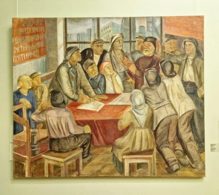 Вперше демонструється і робота бойчукістки Оксани Павленко "П’ятирічка". Погляд одразу чіпляється за гасло: "Творчий ентузіязм мільйонів на зустріч другій п’ятирічці". Форсована індустріалізація особливо сильно позначилася на Україні, де зусиллями більшовиків був штучно створений голод. Зіставимо дати: Голодомор тривав у 1932-1933 роках, тоді як друга п’ятирічка мала розпочалася 1933 року. У роботі жодного натяку на втрати.