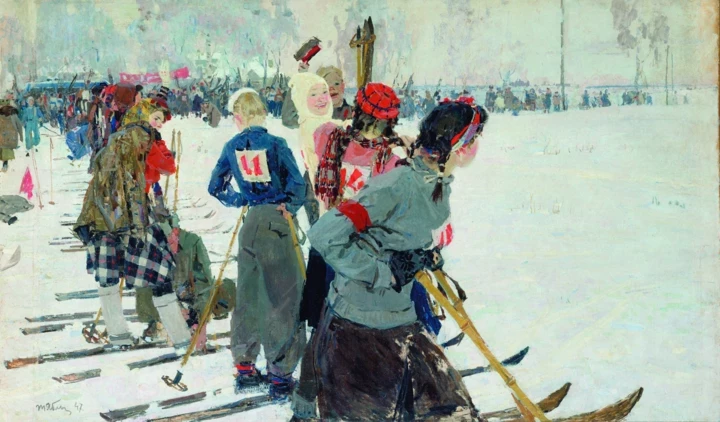 "Молодою я дуже любила лижі, свіже повітря, далекі засніжені простори, сяючі обличчя!.. Із запалом працювала я над цією картиною у перші повоєнні роки", — так пише про своє полотно "На старт" одна з найвизначніших мисткинь в історії українського мистецтва, майстриня пейзажу Тетяна Яблонська, творчість якої нерозривно пов'язана з Києвом. Душевне, тепле за настроєм полотно зображує лижників, які готуються до старту: у цій роботі Яблонської буквально зчитується передчуття радості, яку дарує зимовий досуг.