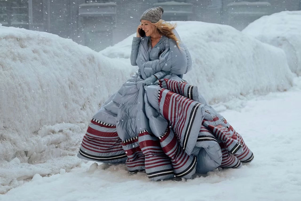 Гібрид пуховика Moncler і бальної сукні — це après-ski у стилі Марії Антуанетти. Абсолютно непрактична річ для засніженого Нью-Йорка, але дуже у стилі Керрі: надмірна, дивна та впізнавана.