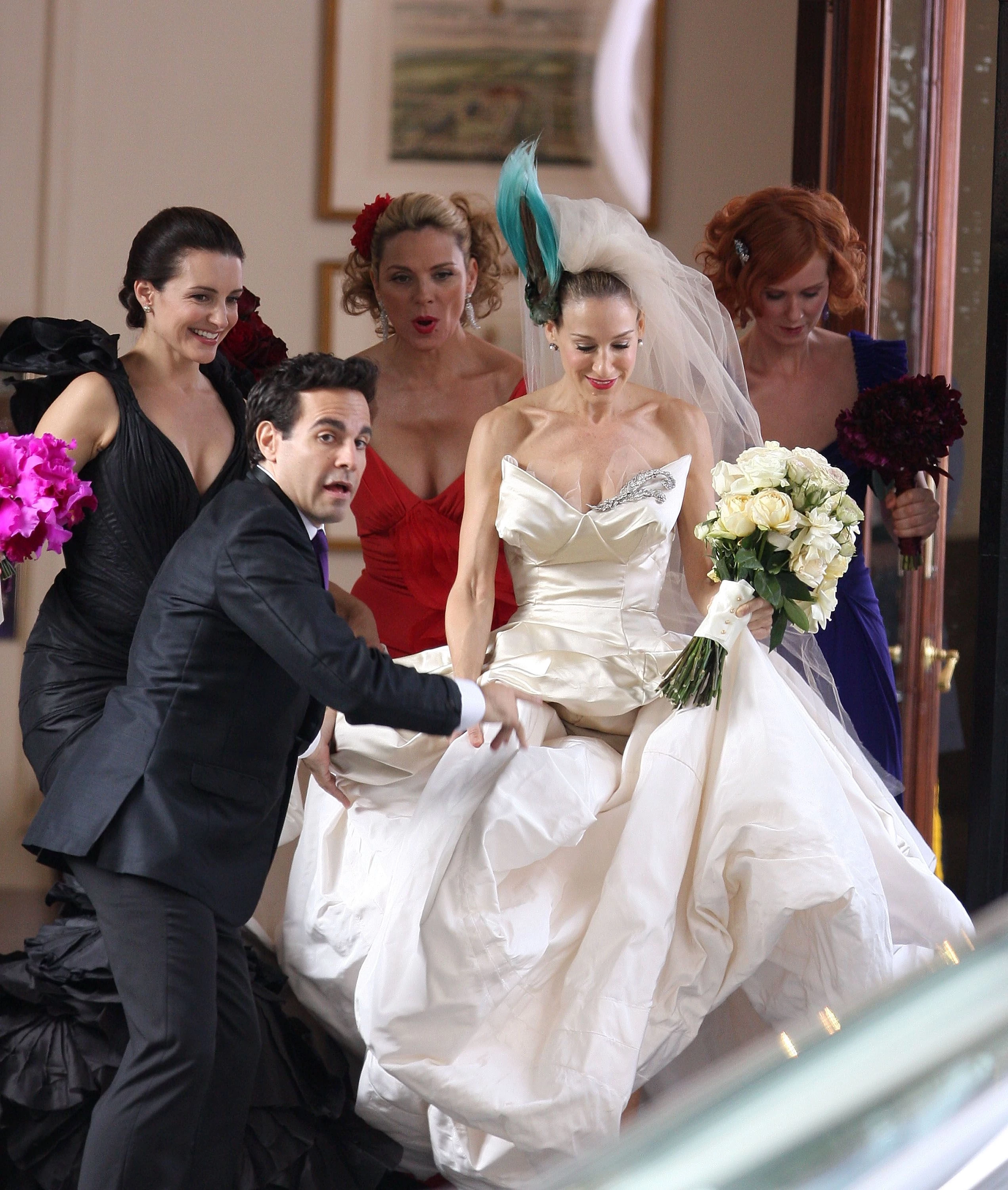 Найвідоміший образ фільму — весільна сукня Vivienne Westwood, у якій Керрі залишили біля вівтаря. Корсетний ліф, пишна спідниця та блакитний пір’яний аксесуар зробили цей образ легендарним. Не дивно, що він став натхненням для багатьох наречених. Керрі знову вдягла цю сукню у другому сезоні "І просто так..." на Met Gala.