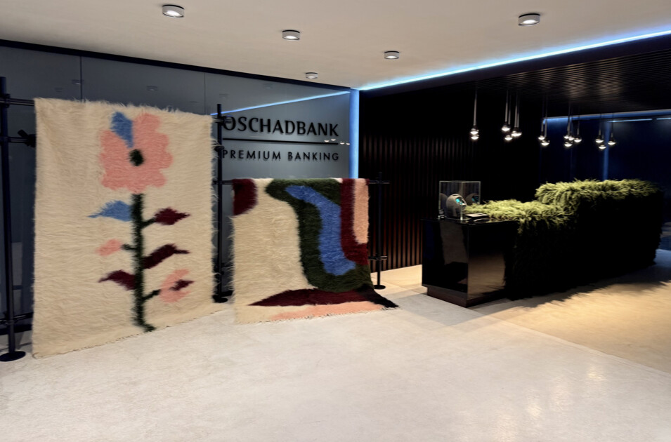 Інсталяція від GUSHKA розкриває глибинну цінність ручної праці й перетворює преміум-центр Ощадбанку на простір, де сучасність поєднується зі спадщиною. В її основі — килимки ручної роботи, які не лише прикрашають робочі зони, а й виступають як самостійні артоб’єкти, поєднуючи утилітарність і художність в одному просторі.