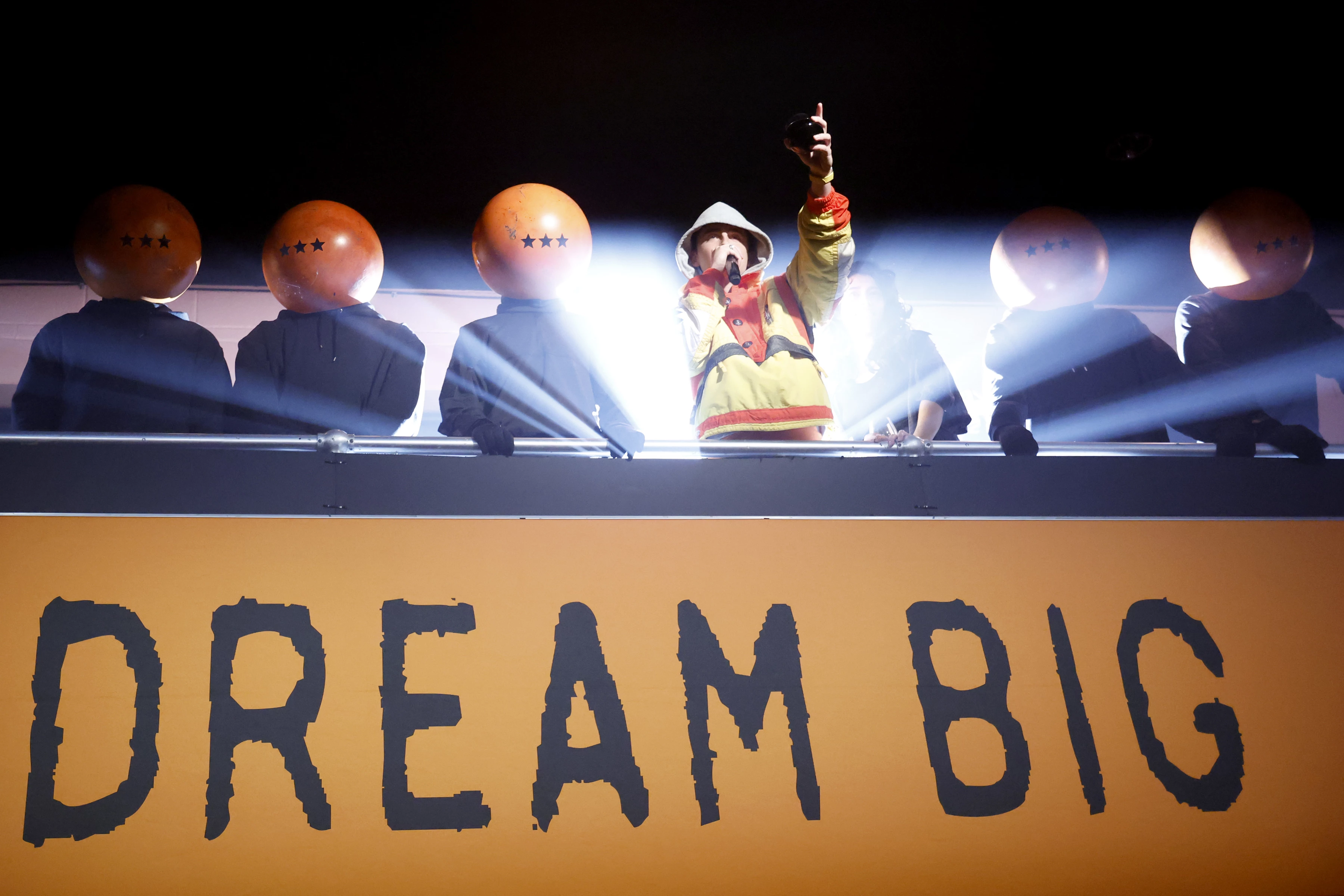 У результаті ми отримали дирижабль над Лос-Анджелесом, куртки в колаборації з Nahmias, шоломи у формі пінг-понгових кульок і появи Шаламе на публіці в суцільно помаранчевих образах — зокрема під час спільних виходів із Кайлі Дженнер, що миттєво масштабували охоплення. І, зрештою, Las Vegas Sphere, де Шаламе став першою людиною, яка фізично опинилася на її вершині, оголошуючи, що "Марті Супрім. Геній комбінацій" виходить у прокат на Різдво.