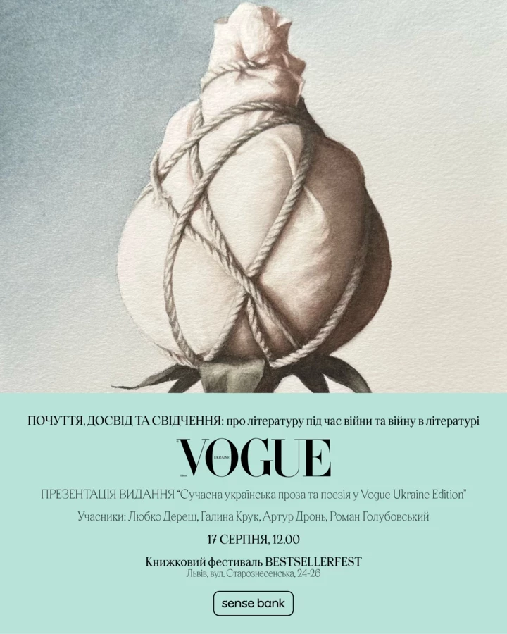 17 серпня у Львові в межах програми книжкового фестивалю BestsellerFest 2025 відбудеться презентація другого видання "Сучасна українська проза та поезія у Vogue Ukraine Edition". Участь у презентації візьмуть зіркові автори й авторки, чиї твори увійшли до збірки, – Любко Дереш, Галина Крук, Артур Дронь і Роман Голубовський. Вони читатимуть уривки зі своїх творів, а також говоритимуть про письменницькі досвіди в часи війни. Модеруватиме подію редакторка відділу "Культура" Vogue Ukraine Дарія Слободяник.