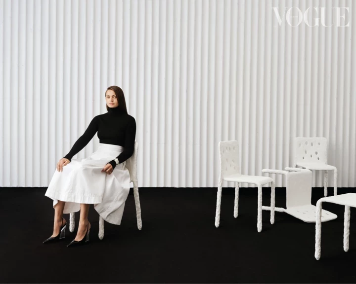 Водолазка Balmain (kameron.ua), спідниця Patou (tsum.ua), туфлі Saint Laurent (kameron.ua), прикраси вінтаж (Poetry in Objects); стільці з колекції ZTISTA