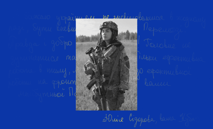 Я Юлія Сідорова, більше відома за позивним Куба. Ще в період Майдану я почала свою боротьбу. У жовтні 2014 року потрапила на фронт, була парамедикинею у складі "Госпітальєрів" до 2017 року. Паралельно навчалася в найкращих інструкторів з тактичної медицини та почала працювати за стандартами НАТО. Завдяки цьому разом із напарницею створили власну медичну службу "Ульф" у складі 1-ї штурмової роти ДУК ПС, де я прослужила до 2019 року.
