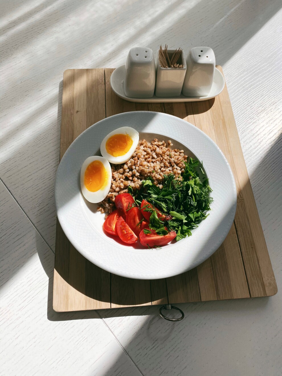 - Готову гречку викладіть на тарілку. Зверху покладіть розрізане яйце, томати і зелень.