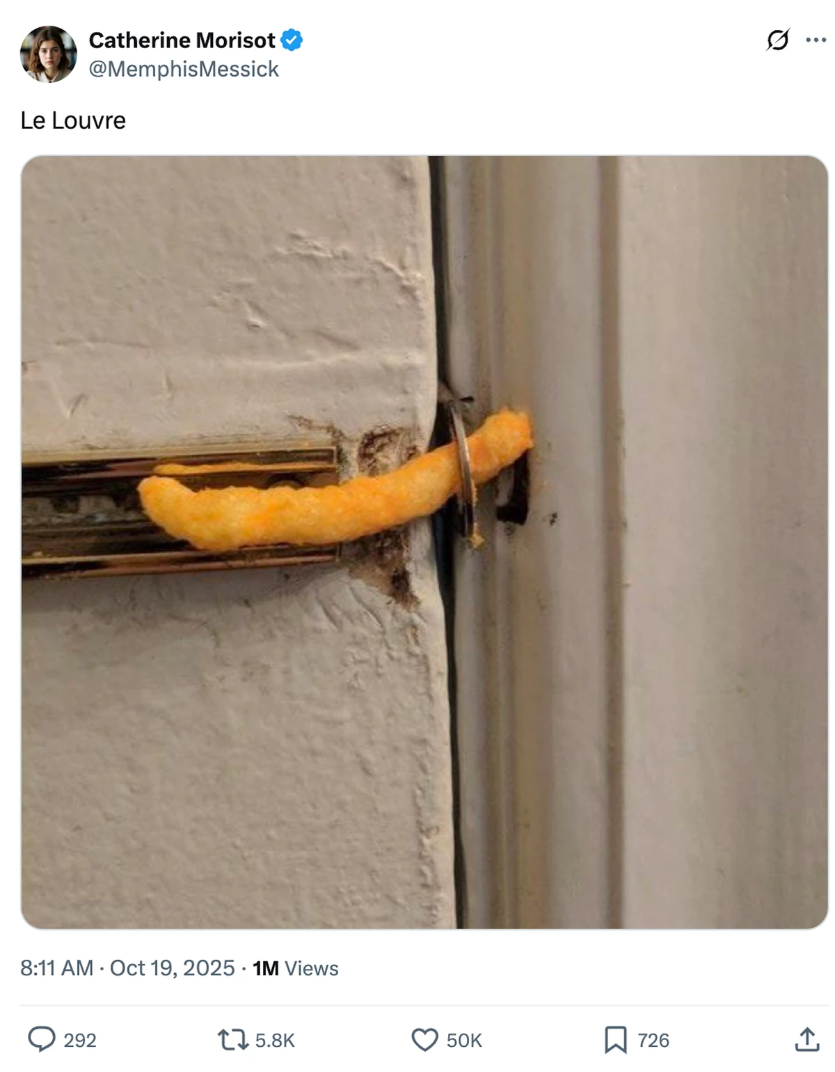 Паралельно інформаційний простір заповнили новини про пограбування Лувру нібито групою привабливих молодиків. Історія швидко стала вірусною, але згодом з’ясувалося, що історія значно прозаїчніша і дивніша, ніж здавалося. Реальне пограбування музею виявилися не таким ефектним й далекими від кінематографічних уявлень.