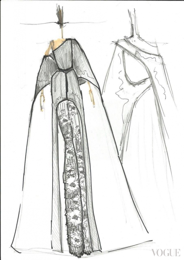 эскиз Ивана Фролова Как рассказал дизайнер Vogue.ua, на этот наряд ушло 25 метров ткани. Сам материал – это смесь шерсти и шелка, который хорошо держит форму. Строгий силуэт наряда символизирует ствол дерева: "Это образ, который означает сильный внутренний стержень человека, подобный сильному дереву, которое не согнут никакие внешние обстоятельства", – говорит Фролов. Для того, чтобы такой сильный образ был одновременно женственным, дизайнер сделал его ассиметричным, приспустив ткань на одном плече. Брюки костюма расшиты кутюрным кружевом и австрийским хрусталем.