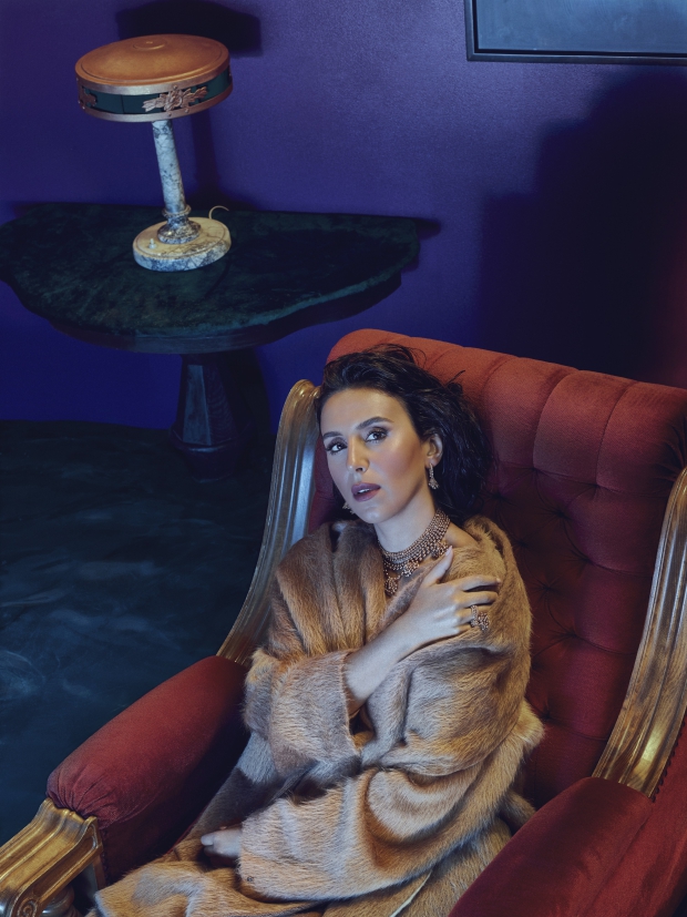 Пальто из альпака, Sportmax. Колье, розовое золото, бриллианты, серьги, розовое золото, бриллианты, кольцо, розовое золото, бриллианты, все – коллекция Paris Nouvelle Vague 2015, CartierМы спешим обратно в "Украину": Джамале предстоит выйти на сцену в самом конце – почти в 10 вечера, но она рассчитывает время так, чтобы быть готовой уже в начале концерта. Пока визажист добавляет объема волосам и гримирует лицо, Джамала делает десяток дел. По телефону дает интервью о своих любимых украинских композиторах (это Прокофьев – потому что родом из Донецкой области, Станкевич и Сильвестров). Следом за ним – еще одно, о любимых киевских концертных площадках (Closer, Sentrum и Pink Freud). Вместе с ассистентом перебирает варианты, куда ей улететь на каникулы в конце этой недели: "Там обязательно должны быть пальмы и температура не ниже 30 градусов". Принимает приглашение на встречу с режиссером Гаспаром Ноэ: кино – ее самая большая страсть после музыки, и она уверена, что этой любовью "притянула" свою роль в прошлогоднем "Поводыре". Просматривает ленту "Фейсбука" в поисках откликов на новый альбом: "Рецензии простых людей всегда точнее и интереснее, чем профессиональные". И наконец – разбирает приглашения на показы Ukrainian Fashion Week, которая торжественно открывается в этот самый момент, когда мы сидим в гримерной. Четыре раза за вечер Джамала сетует, как неудобно ей перед главой оргкомитета UFW Ириной Данилевской принять приглашение и не прийти, и все надеется, что вечеринка в честь открытия затянется, чтоб хотя бы под занавес успеть на нее после концерта.