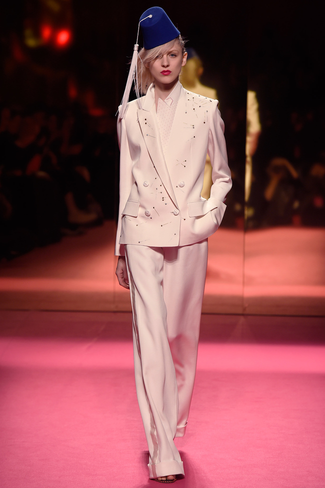 Несколькими часами ранее  для пресс-конференции актриса также выбрала наряд белого цвета – костюм из коллекции Schiaparelli Couture весна-лето 2015. Именно он открывал показ, который только на прошлой неделе прошел в Париже.