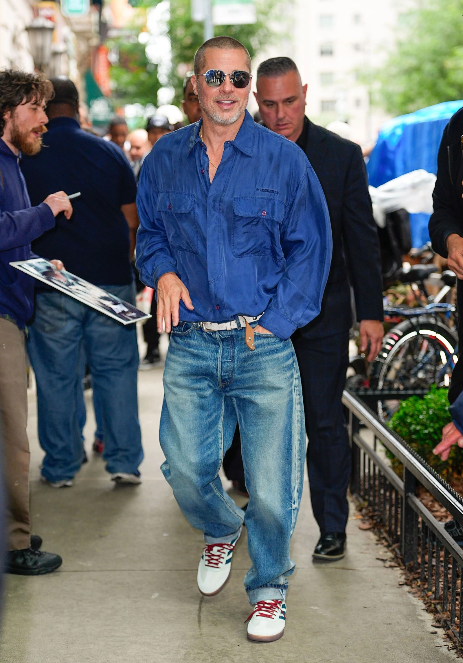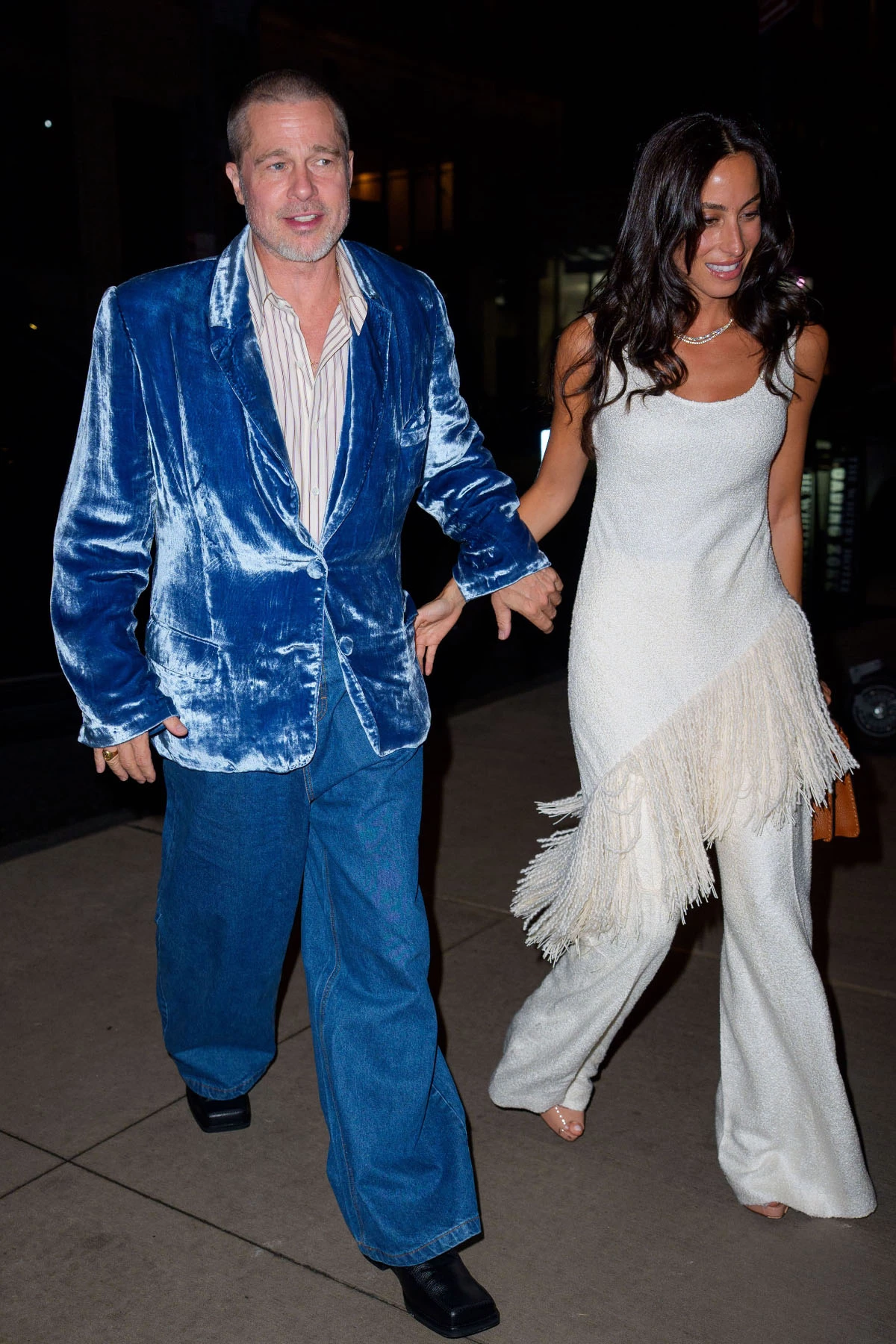 Разом із партнеркою Інес де Рамон актор дотримується стилістичної гармонії, але вільно: коли вона вдягається у total black, він обирає схожий, але кольоровий образ, а її беж підкреслює яскравим масляно-жовтим. Бред Пітт також демонструє гнучкість свого нового стилю через неочікувані речі – шовкову сорочку й широкі джинси з осінньо-зимової колекції Magliano 2025/2026 або оксамитову куртку, поєднану з денімом і смугастою сорочкою, ключовим акцентом образу. Усе — в тонкій гармонії із вбранням Інес.