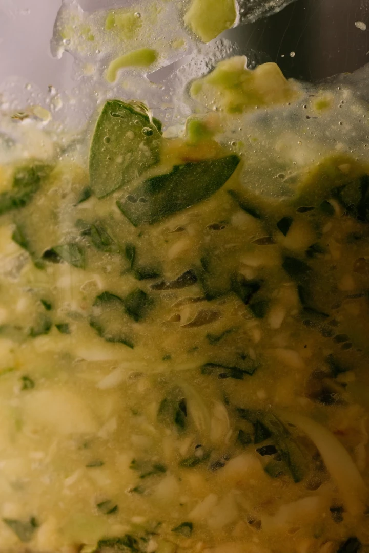 Додаємо туди шпинат, жовтки, розтоплене масло, мед, збиваємо.