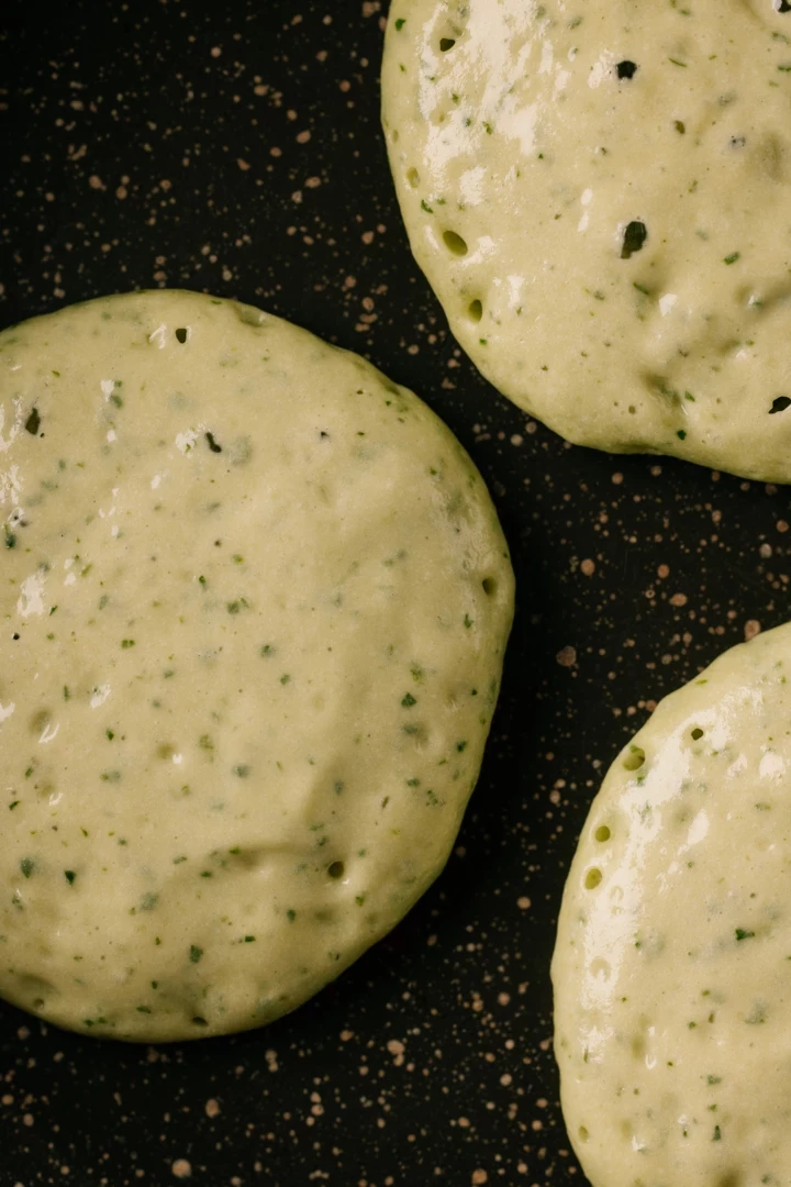 Розігріваємо сковорідку та починаємо смажити млинці на середньому вогні. Викладаємо тісто ложкою та смажимо 2-3 хвилини до появи бульбашок на поверхні.