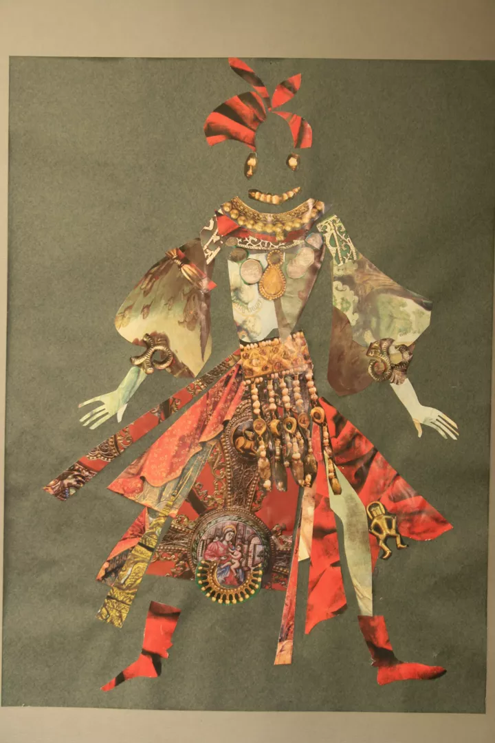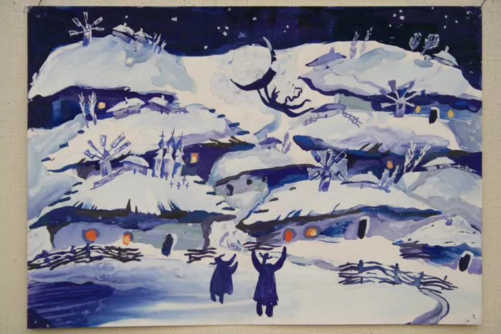 Ескізи костюмів до постановки 1993 року"Тоді ми з моїм сином часто їздили в Пирогово — мій друг мав там стайню",— згадує Марія про період роботи над першою виставою. — Була така гарна зима — і я пам'ятаю, як ми йшли до стайні, що вже ближче до лісу, просто до пояса у снігу... А коли каталися на конях, то я вдивлялися у засніжені білі хати на тлі сірого неба, млини, і мені здавалося, що і хати, і млини в Пирогово живуть своїм життям, а з-за рогу хати ось-ось вигляне чорт. Все це було схоже на фантасмагорію і я реально почувалася героїнею гоголівської повісті — ось так я і вигадала ці костюми, під великим враженням від тодішніх прогулянок у Пирогово".