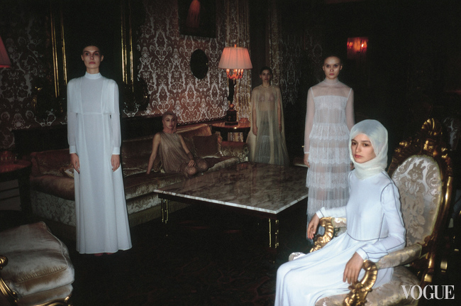 На моделях (слева направо): белое платье из хлопка, архив Valentino; платье из фатина и шелка, Cristina Bomba; накидка из тюля, Cristina Bomba; платье из шелка и кружева, архив Valentino; белое платье из хлопка, архив Valentino; накидка из фатина, надетая на голову, Cristina Bomba. Фото: Vanessa Beecroft