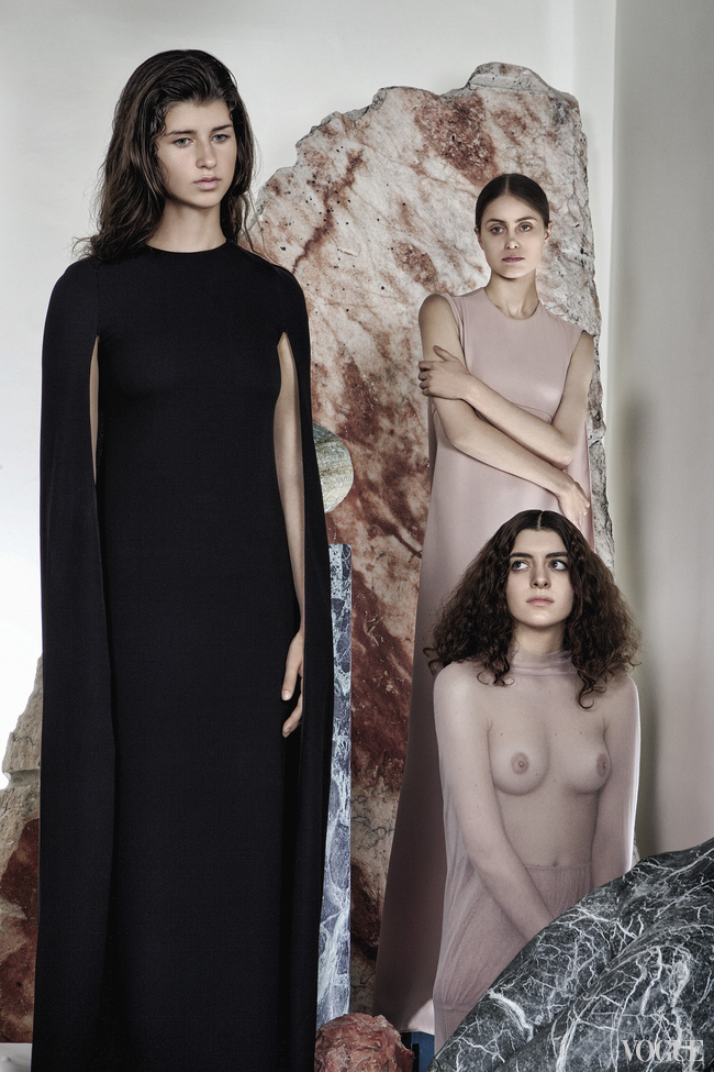 На моделях (слева направо): черное платье из хлопка, архив Valentino; бежевое платье из хлопка, архив Valentino; накидка из тюля, Cristina Bomba. Фото: Luca Peruzzi
