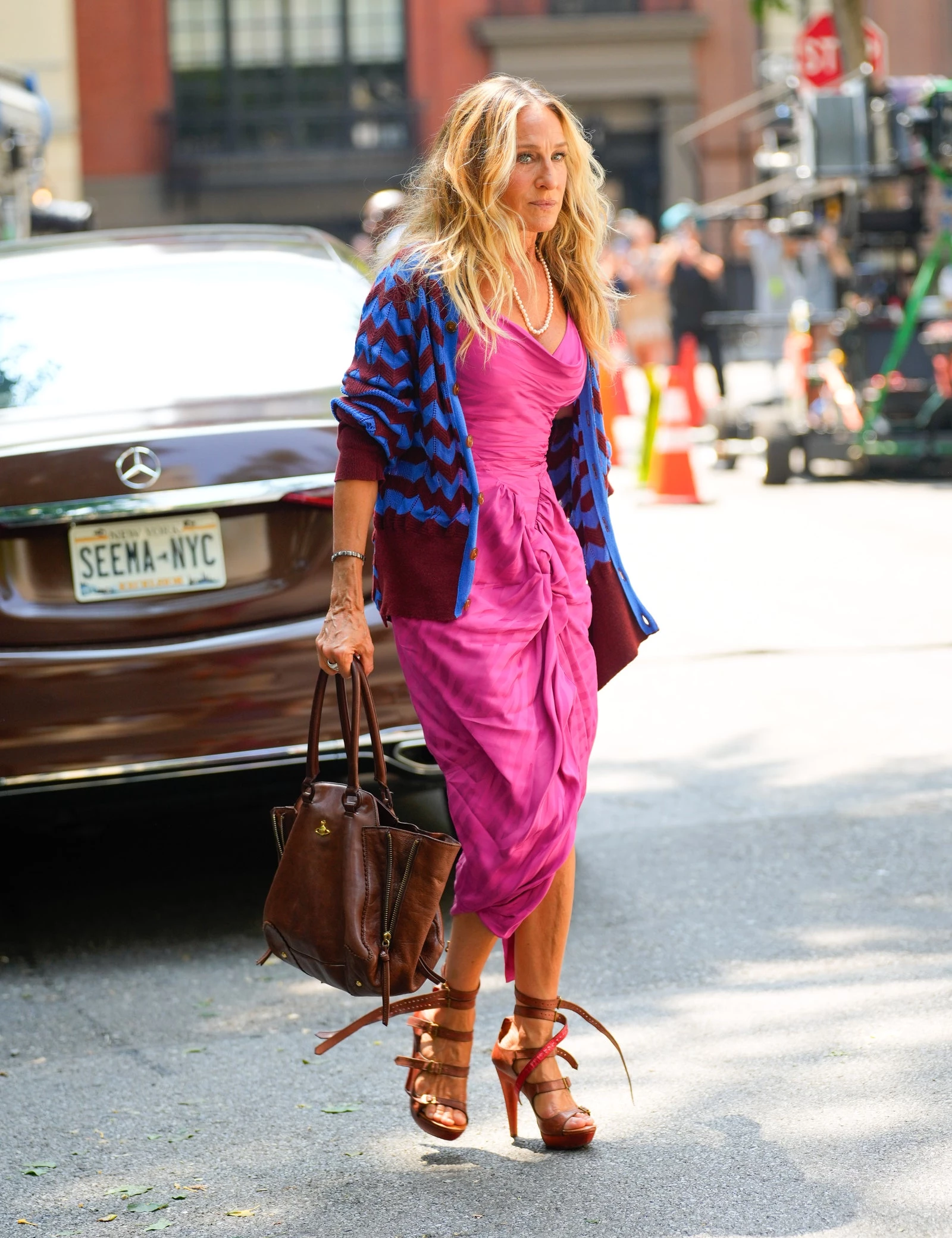 Сара Джессіка Паркер в образі Керрі Бредшоу знову показала, як створити стильний образ для будь-якого віку. Вона обрала елегантну сукню, яка пасуватиме як для світської вечері чи весілля, так і для ділового заходу. Але зробила образ повсякденним, додавши кардиган і бохо-босоніжки на платформі.